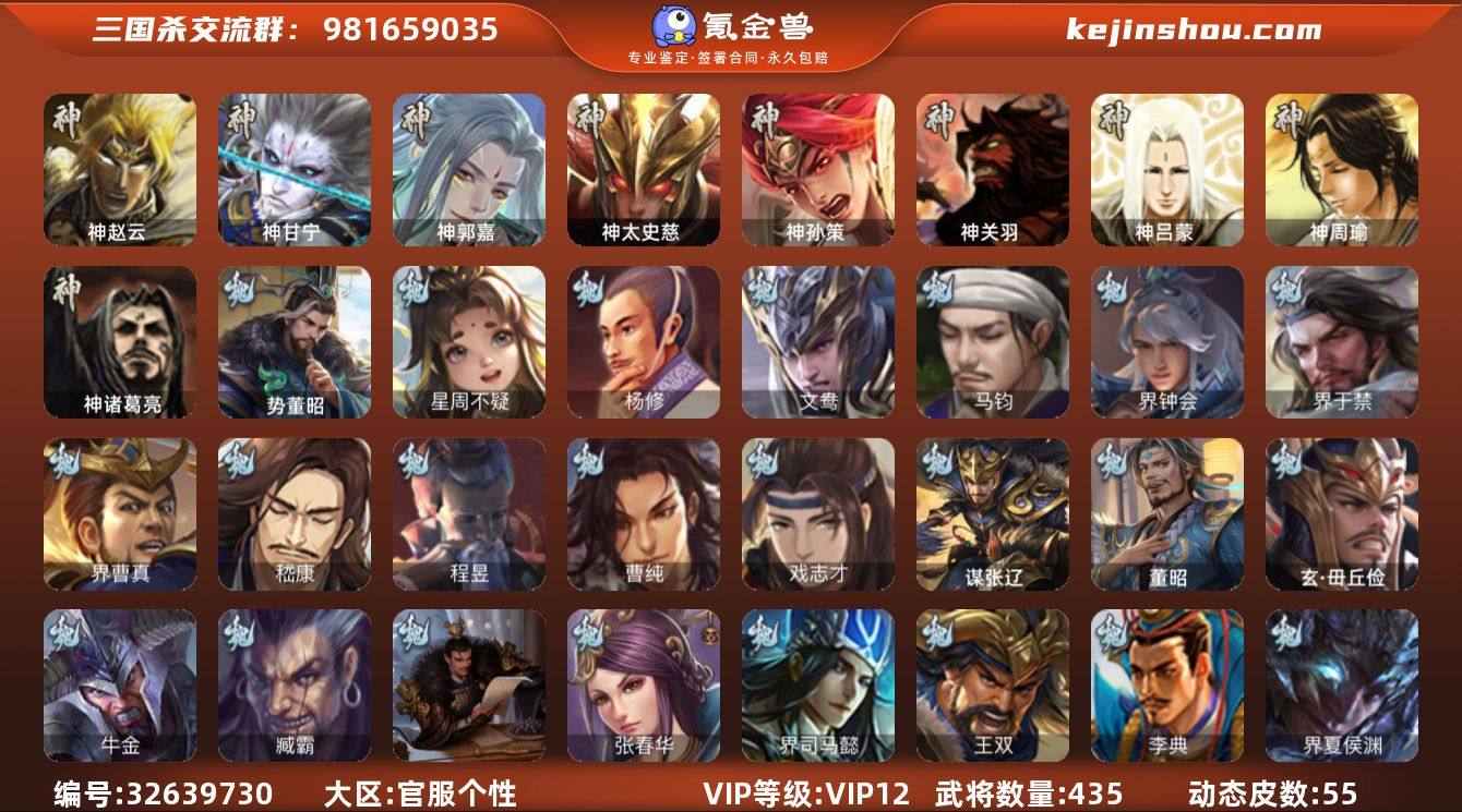 官阶:大将军;VIP等级:VIP12;史诗武将数量:51;动态皮肤数量:55;武将总数:435;史诗宝珠数量:2;将魂数量:8681;神将:6;魏国史诗武将:31;蜀国史诗武将:10;吴国史诗武将:10;群史诗武将:17 神赵云,神甘宁,神郭嘉,神太史慈,神孙策,神诸葛亮,星周不疑,杨修,马钧,界钟会,界于禁,界曹真,嵇康,曹纯,戏志才,势董昭,程昱,马云騄,谋赵云,谋马超,诸葛瞻,张星彩,王平,沙摩柯,谯周,界黄忠,花鬘,周处,吴景,骆统,留赞,界朱然,界徐盛,界步练师,贺齐,文鸯,界沮授,左慈,张让,星黄忠,审配,麹义,南华老仙,沮授,界李儒,公孙康,杜预,谋张角,许攸,星董卓,兀突骨,司马昭,神吕蒙,神周瑜,神关羽,SP关羽,SP曹仁,SP蔡文姬,乐进,曹昂,诸葛诞,朱灵,文聘,SP姜维,张春华,钟会,曹冲,郭淮,满宠,界王异,界曹操,界司马懿,界夏侯惇,界张辽,界许褚,界郭嘉,李典,曹真,韩浩史涣,陈群,曹叡,曹休,钟繇,司马朗,王基,李通,郭皇后,孙资刘放,辛宪英,界甄姬,吕虔,鲁芝,蒯越蒯良,界典韦,界荀彧,界徐晃,杜畿,界曹丕,毌丘俭,界邓艾,张恭,贾逵,界曹植,界曹彰,界满宠,界郭淮,卞夫人,辛毗,华歆,蔡贞姬,袁涣,王双,崔琰,毛玠,阮慧,谋徐晃,谋于禁,谋荀彧,界曹休,牵招,胡班,玄毌丘俭,司马孚,文钦,谋张辽,牛金,界夏侯渊,臧霸,唐咨,...