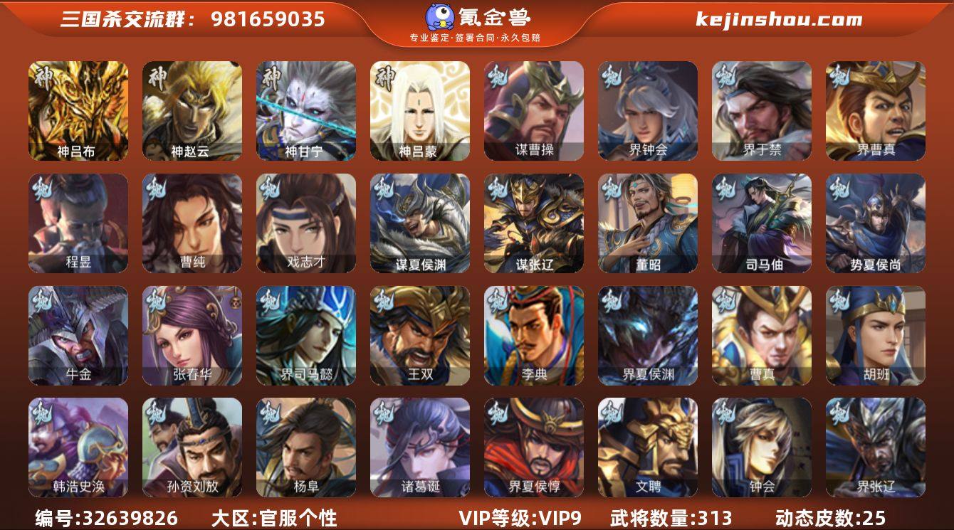【4160】官阶:骠骑将军;VIP等级:VIP9;史诗武将数量:25;动态皮肤数量:25;武将总数:313;史诗宝珠数量:0;将魂数量:8021;神将:4;魏国史诗武将:9;蜀国史诗武将:7;吴国史诗武将:4;群史诗武将:7
