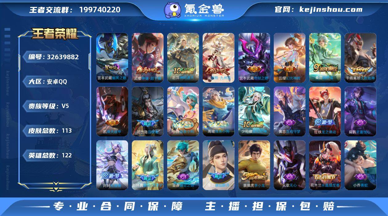 安卓QQ区】王者荣耀成品号诚心出 ✅ 账号基础:V5贵族 | 122/129英雄 | 113皮肤 | 全满铭文 | 1938场对战 ✅ 核心皮肤亮点: - 星传说:幽冥之眼(稀有星元品质) - 传说皮肤8款:云缨神骥·越千峰(马年限定)、后羿神树通天(10周年限定)、澜愿照·九州拓(蛇年限定)、云缨幻光神枪、桑启鸣野蒿(9周年限定)、铠绛天战甲、干将莫邪久胜战神(FMVP)、宫本武藏地狱之眼 - 限定皮肤:战令限定、活动专属、新春专属、源·梦系列等多款收藏级皮肤 ✅ 优势:全满铭文,无需攒碎片,买号即巅峰;英雄池深,适配各种阵容;安卓QQ区流通性强,换绑安全,找回包赔(可走平台担保) 价格可谈,诚心出售,骗子勿扰,