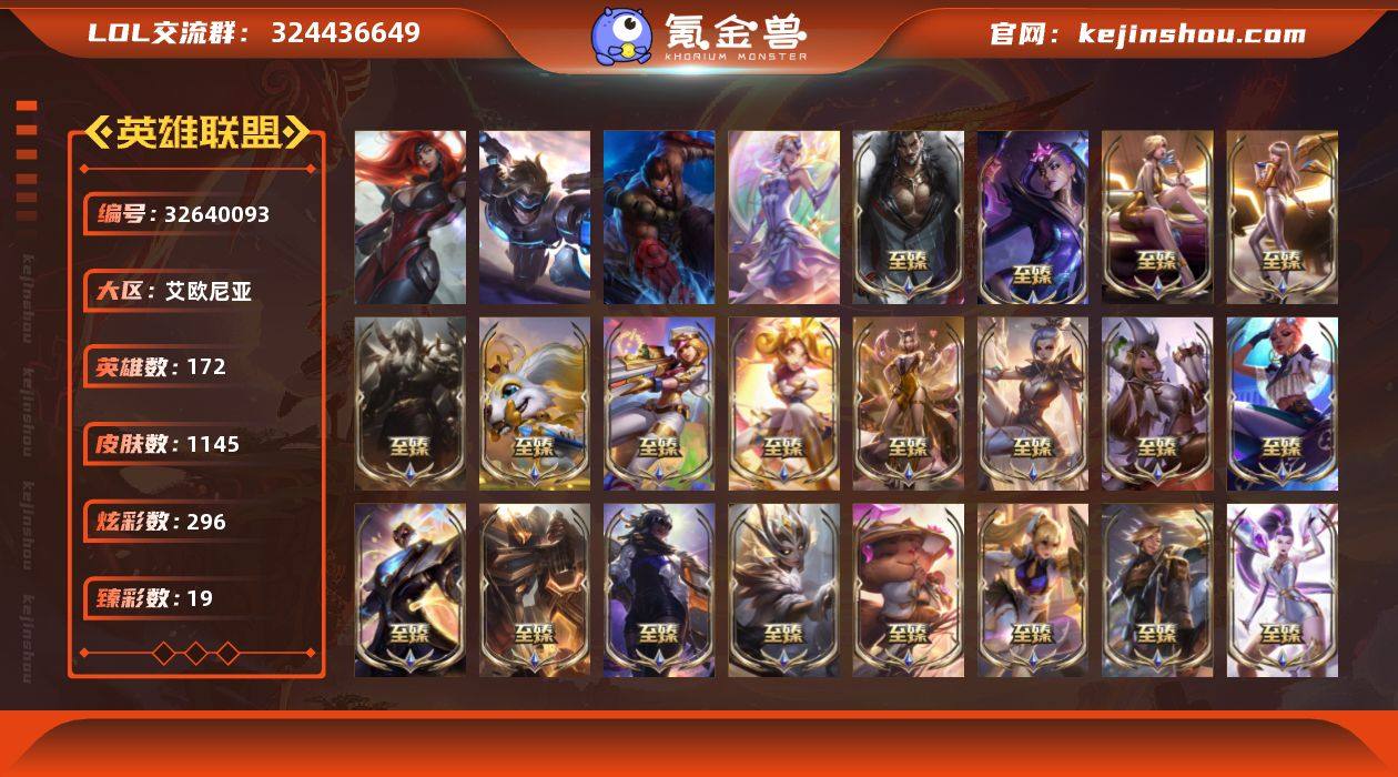 t38408【艾欧尼亚】1145皮肤 296炫彩 19臻彩 65神话/192限定/102传说/172英雄 账号等级:327【重要头像】爱意绵绵 爱情之歌 觅心游侠卢锡安 觅心之翼奎因 雪花 玉剑传说苍鸾炫彩 我麦是开的么 魔女伊芙琳 魔女艾希炫彩 魔女艾希 魔女阿狸炫彩 魔女阿狸 黎明使者莫甘娜 青花瓷拉克丝 魅惑女巫厄运小姐 万圣节妮蔻 万圣节赛娜 万圣节乐芙兰 万圣节卡西奥佩娅 幻灵战斗队长厄运小姐 灵魂莲华阿狸 永恒之森阿狸 星守金克丝炫彩 灵魂莲华辛德拉 灵魂莲华索拉卡 灵魂莲华卡西奥佩娅 灵魂莲华厄斐琉斯 灵魂莲华崔丝塔娜 神龙尊者卡尔玛 魔女乐芙兰炫彩 魔女乐芙兰 魔女卡西奥佩娅炫彩 魔女卡西奥佩娅 魔女婕拉炫彩 青花瓷伊泽瑞尔 青花瓷阿木木 沐浴震惊 执事蕾欧娜炫彩 执事蕾欧娜 执事乐芙兰炫彩 执事乐芙兰 烈焰仙子黛安娜 招财进宝提莫 虎头虎脑崔丝塔娜 魔女莫甘娜炫彩 西部天使赛娜神话炫彩 真实伤害赛娜炫彩 地下都市婕拉 至臻青花瓷拉克丝 至臻魅惑女巫莫甘娜 至臻魔女乐芙兰 至臻战斗学院蕾欧娜 至臻魔女婕拉 水晶圣骑塔利亚炫彩头 水晶圣骑艾希头 【重要皮肤】机神玄武盖伦至臻 狼神英灵斯维因至臻 暗星女王黛安...