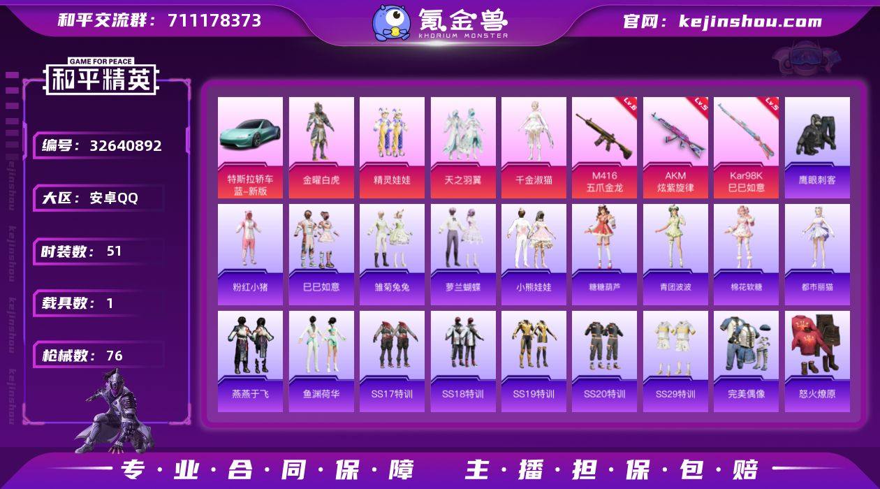 【店主推荐捡漏号!可直接换绑】安卓 手Q-4粉装-5特效枪-1载具-1粉色飞行器-25568热力值-4王牌印记-51套装-76枪皮【热门品类】:套装-粉红小猪【粉色套装】:粉装-金曜白虎,粉装-精灵娃娃,粉装-天之羽翼,角色-千金淑猫【粉色枪皮等级】:AKM-炫紫旋律(五级),M416-五爪金龙(六级),Kar98K-巳巳如意(五级),Mk14-福马献瑞(四级),PKM-萌骑夺宝(一级)【粉色载具】:特斯拉Roadster(水滴蓝)【粉色枪皮】:AKM-炫紫旋律,M416-五爪金龙,Kar98K-巳巳如意,Mk14-福马献瑞,PKM-萌骑夺宝【粉色飞行器】:天之羽翼飞行器