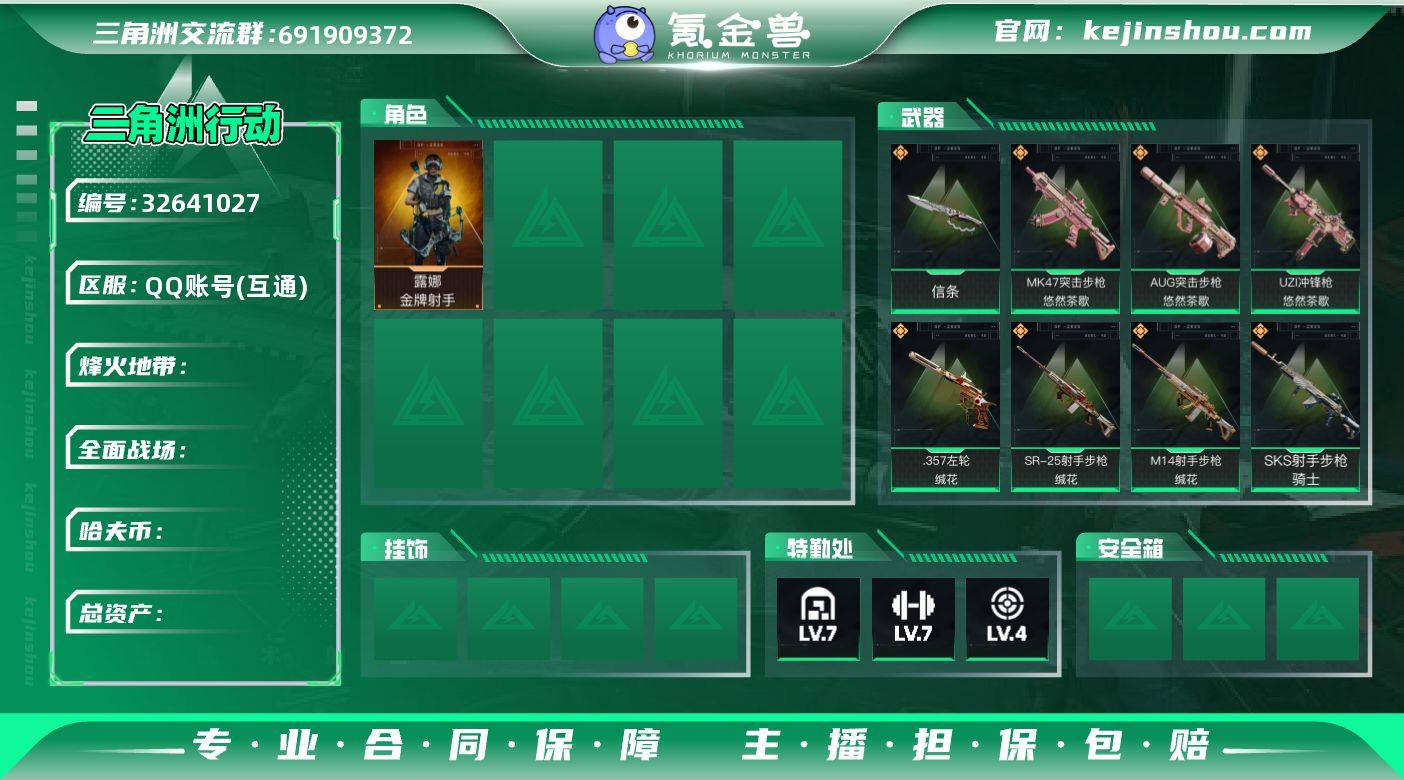 YQ-总资产98m/哈夫币28m/部门23211 【悠然茶歇/缄花套 信条单刀 露娜-运动员 仓库7级 训中满级 靶场4级 s8赛季3x3已出】 等级 60 烽火段位 黑鹰V 橙:UZI悠然茶歇,AUG悠然茶歇,MK47悠然茶歇,M14缄花,SR缄花,.357缄花,SKS骑士,SG552运动员, 刀:近战信条, 限时道具/段位以实际验号为准。如账号因没有维护,赛季更新等不可抗因素发生变化,不属于账号质量问题差""