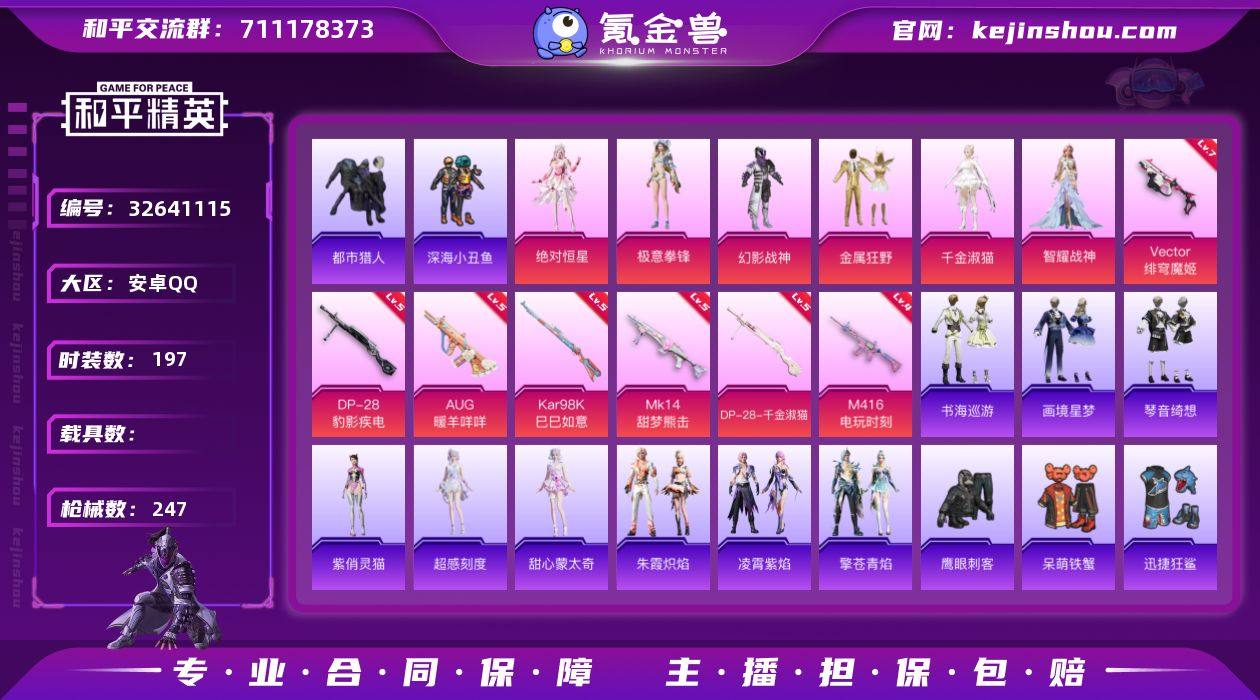 安卓 手Q-6粉装-11特效枪-0载具-2粉色飞行器-75902热力值-10王牌印记-197套装-247枪皮 【热门品类】:套装-浪漫天命,套装-都市猎人,套装-深海小丑鱼,套装-小丑鱼,套装-暗夜之虎,套装-龟仙人,套装-暗影哥特,角色-Mark.06 【粉色套装】:角色-绝对恒星,粉装-幻影战神,粉装-金属狂野,角色-千金淑猫,角色-智耀战神,粉装-极意拳锋 【粉色枪皮等级】:M416-电玩时刻(四级),AUG-暖羊咩咩(五级),ACE32-萌骑漫游(五级),UMP45-萌骑冒险(五级),Vector-绯穹魔姬(七级),AKS-74U-森灵之息(五级),Kar98K-巳巳如意(五级),Mk14-甜梦熊击(五级),Mk14-福马献瑞(二级),DP-28-千金淑猫(五级),DP-28-豹影疾电(五级) 【粉色枪皮】:M416-电玩时刻,AUG-暖羊咩咩,ACE32-萌骑漫游,UMP45-萌骑冒险,Vector-绯穹魔姬,AKS-74U-森灵之息,Kar98K-巳巳如意,Mk14-甜梦熊击,Mk14-福马献瑞,DP-28-千金淑猫,DP-28-豹影疾电 【粉色飞行器】:绝对恒星飞行器,炫彩糖果飞行器 【粉色降落伞】:绝对恒星降落伞,星之彼岸降落伞,第五大道降落伞,仲夏莫吉托降落伞,精灵梦叶罗丽降落伞,金丰海韵降落伞,千金淑猫降落伞,绯果甜心降落伞,冷漠罗丽降落伞,喜羊羊与灰太狼降落伞,异瞳...