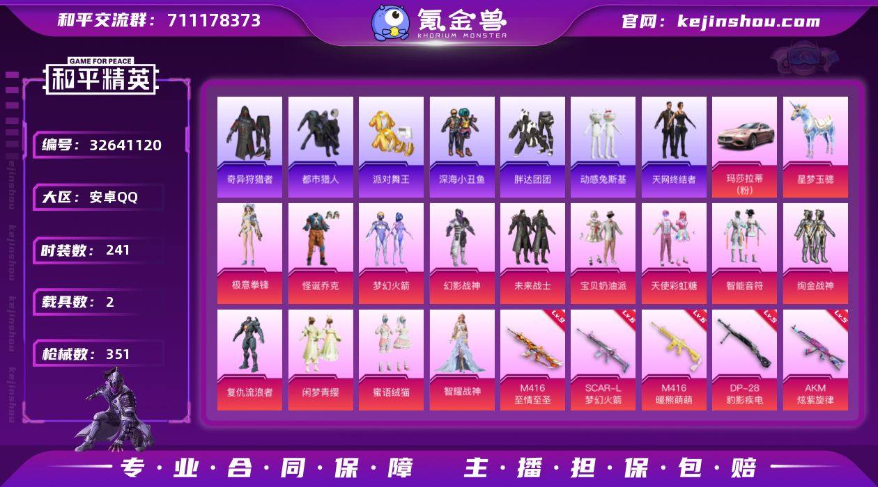 【店主推荐捡漏号!可直接换绑】安卓 手Q-13粉装-17特效枪-2载具-5粉色飞行器-109999热力值-20王牌印记-241套装-351枪皮【热门品类】:粉装-怪诞乔克,粉装-梦幻火箭,套装-浪漫天命,套装-都市猎人,套装-派对舞王,套装-深海小丑鱼,套装-小丑鱼,套装-奇异狩猎者,套装-胖达团团,套装-天网终结者,套装-动感兔斯基人偶服,套装-暗夜之虎,套装-龟仙人,套装-暗影哥特,套装-粉红小猪,M416-星际漫游,套装-红熊茄茄【粉色套装】:粉装-幻影战神,粉装-未来战士,粉装-怪诞乔克,粉装-宝贝奶油派,粉装-天使彩虹糖,粉装-梦幻火箭,粉装-智能音符,粉装-绚金战神,角色-复仇流浪者,粉装-闲梦青缨,粉装-蜜语绒猫,角色-智耀战神,粉装-极意拳锋【粉色枪皮等级】:AKM-炫紫旋律(五级),SCAR-L-梦幻火箭(六级),SCAR-L-锦绣绵绵(五级),M416-五爪金龙(一级),M416-暖熊萌萌(六级),M416-至情至圣(九级),AUG-暖羊咩咩(五级),ACE32-萌骑漫游(三级),UMP45-萌骑冒险(二级),AKS-74U-森灵之息(五级),Kar98K-巳巳如意(五级),M24-镜域双华(三级),Mk14-福马献瑞(五级),AA12-G-萌骑幻想(二级),DP-28-豹影疾电(五级),MG3-梦幻舞会(五级),PKM-萌骑夺宝(二级)【粉色载具】:玛...