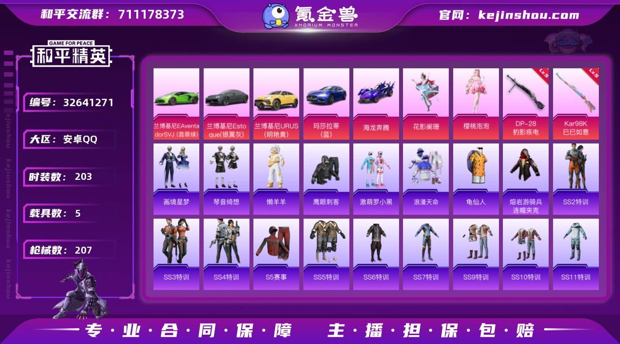 【特价出售/店主推荐】安卓 手Q-2粉装-6特效枪-5载具-65908热力值-20王牌印记-203套装-207枪皮【热门品类】:套装-浪漫天命,套装-SS1特训,套装-龟仙人,熔岩游骑兵连帽夹克【粉色套装】:粉装-花影阑珊,角色-樱桃泡泡【粉色枪皮等级】:ACE32-萌骑漫游(三级),UMP45-萌骑冒险(二级),Kar98K-巳巳如意(五级),Mk14-福马献瑞(三级),AA12-G-萌骑幻想(五级),DP-28-豹影疾电(五级)【粉色载具】:兰博基尼Aventador SVJ(翡翠绿),兰博基尼Estoque(银翼灰),兰博基尼URUS(明艳黄),玛莎拉蒂Ghibli(蓝),海龙奔腾