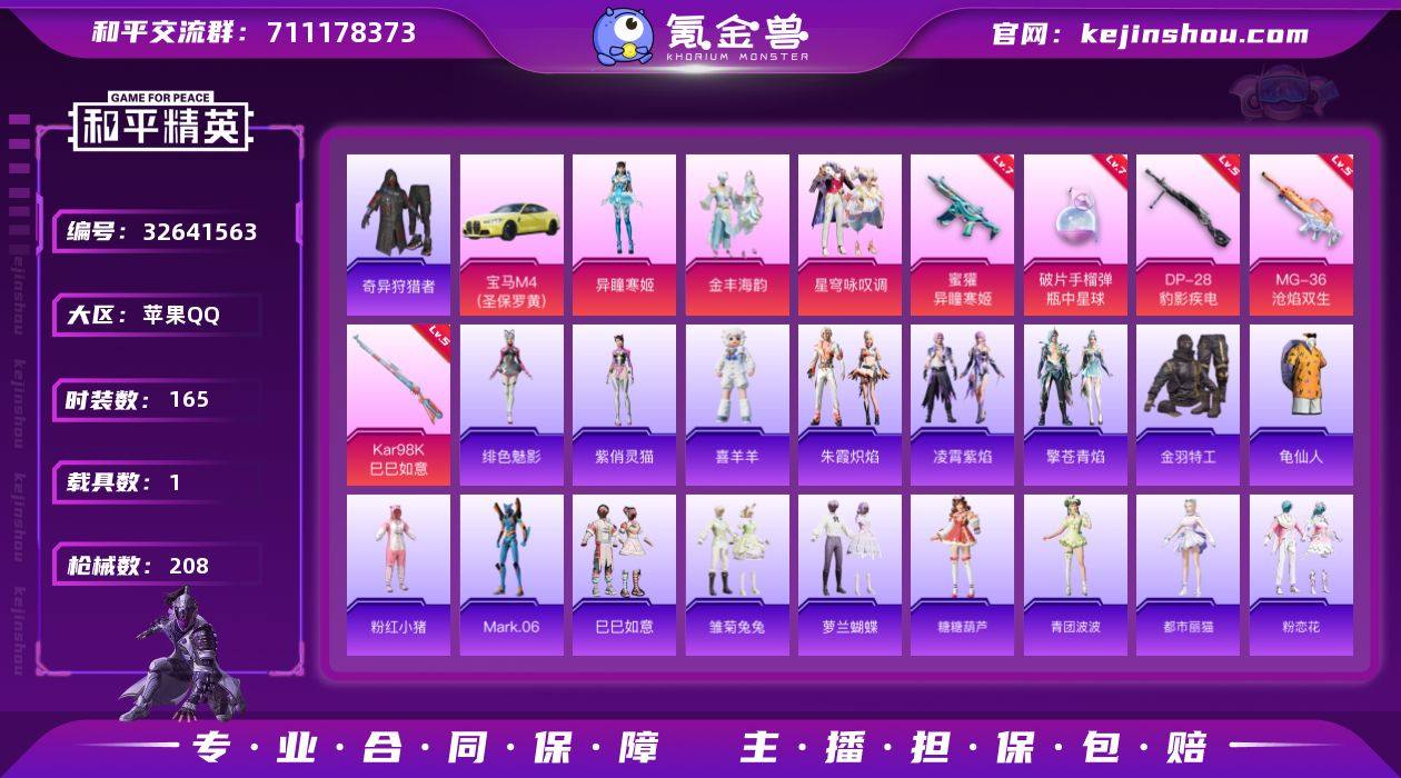 苹果 手Q-4粉装-5特效枪-1载具-3粉色飞行器-63943热力值-12王牌印记-165套装-208枪皮 【热门品类】:套装-奇异狩猎者,套装-金羽特工,套装-龟仙人,套装-粉红小猪,角色-Mark.06 【粉色套装】:粉装-金丰海韵,粉装-星穹咏叹调,角色-异瞳寒姬,角色-罪夜之冕 【粉色枪皮等级】:蜜獾-异瞳寒姬(七级),Kar98K-巳巳如意(五级),DP-28-豹影疾电(五级),MG-36-沧焰双生(五级),破片手榴弹-瓶中星球(七级) 【粉色载具】:宝马M4(圣保罗黄) 【粉色枪皮】:蜜獾-异瞳寒姬,Kar98K-巳巳如意,DP-28-豹影疾电,MG-36-沧焰双生,破片手榴弹-瓶中星球 【粉色飞行器】:炫彩糖果飞行器,魔法神域飞行器,绛云霓裳飞行器 【粉色降落伞】:洛神天依降落伞,橘柚倾心降落伞,筑梦精灵降落伞,第五大道降落伞,萌物绒绒降落伞,精灵梦叶罗丽降落伞,金丰海韵降落伞,智耀战神降落伞,无垠阁降落伞,喜羊羊与灰太狼降落伞,异瞳寒姬降落伞,炫彩糖果降落伞,罪夜之冕降落伞,绛云霓裳降落伞 【稀有套装】:套装-龟仙人,套装-巳巳如意,套装-雪国风尚,套装-炫彩糖果,套装-雏菊兔兔,套装-萝兰蝴蝶,套装-糖糖葫芦,套装-青团波波,角色-都市丽猫,套装-粉恋花,套装-紫幽梦,套装-蓝冰羽...