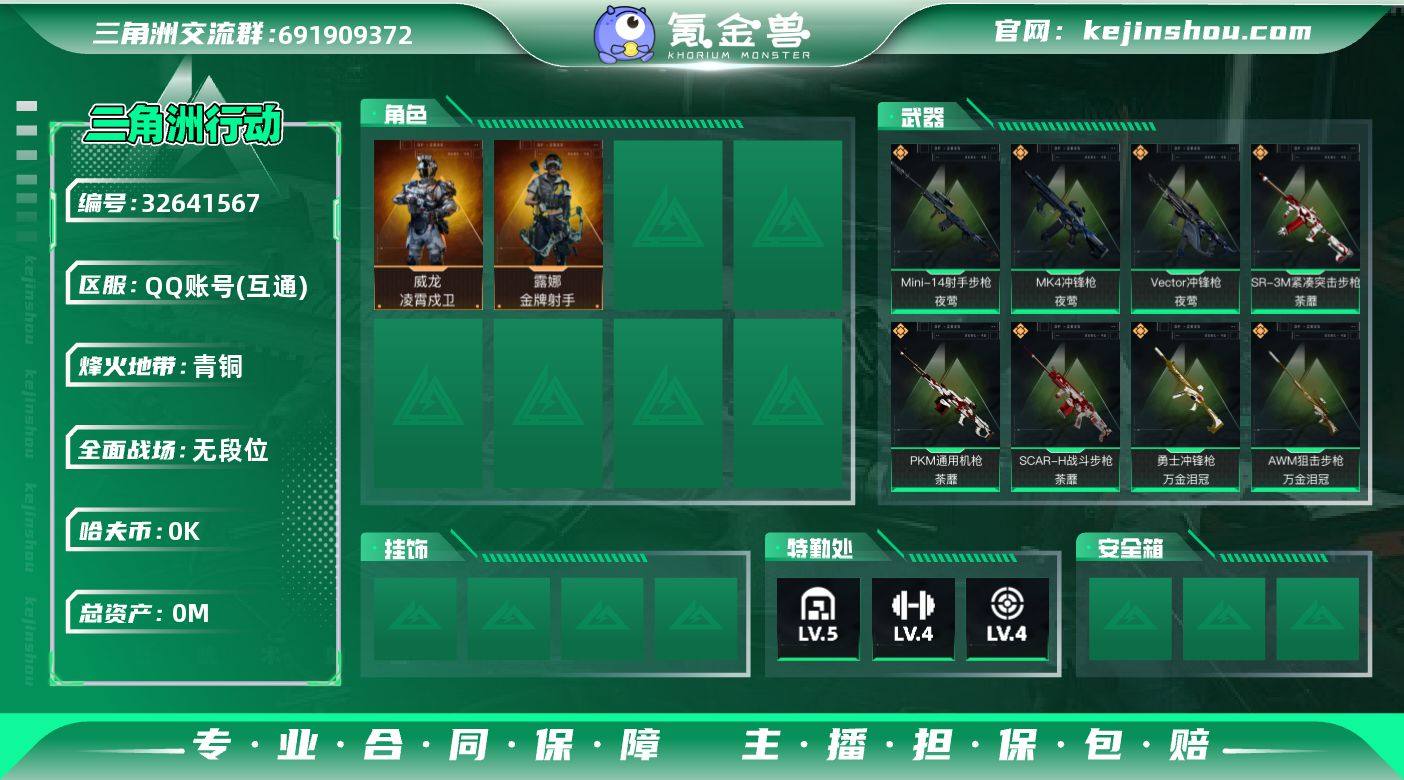 实名: 不可修改 烽火地带段位: 青铜 全面战场段位: 无段位 总资产: 57 哈夫币: 5 干员外观: 露娜-金牌射手(S7),威龙-凌霄戍卫 传说武器皮肤: R93狙击步枪-维什戴尔,SCAR-H战斗步枪-启航,KC17突击步枪-电锯惊魂,SG552突击步枪-运动员,QBZ95-1突击步枪-凌霄戍卫,SCAR-H战斗步枪-荼蘼,PKM通用机枪-荼蘼,SR-3M紧凑突击步枪-荼蘼,Vector冲锋枪-夜莺,MK4冲锋枪-夜莺,Mini-14射手步枪-夜莺,勇士冲锋枪-万金泪冠,腾龙突击步枪-万金泪冠,AWM狙击步枪-万金泪冠