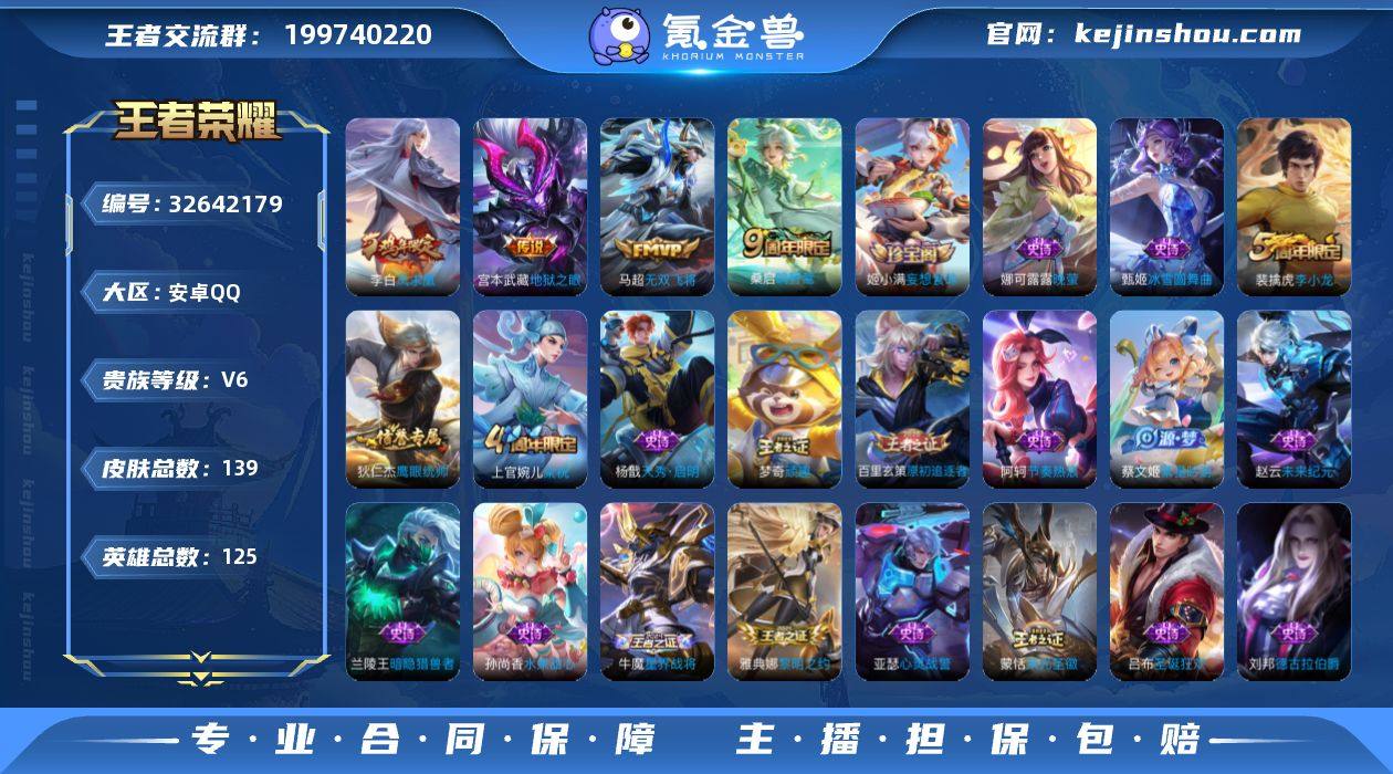 125英雄-139皮肤-安卓QQ/精品打野号/附赠抢先服小国元歌/至尊星耀/139皮肤/125英雄/4传说/32史诗/7稀有英雄 【4 传说皮肤】无双飞将 马超,凤求凰 李白,地狱之眼 宫本武藏,鸣野蒿 桑启, 【32 史诗皮肤】天秀·启明 杨戬,妄想食味 姬小满,德古拉伯爵 刘邦,心灵战警 亚瑟,线条小狗 周瑜,顽趣 梦奇,魅力维加斯 妲己,偶像歌手 王昭君,荣光圣徽 蒙恬,晚萤 娜可露露,繁星吟游 蔡文姬,鹰眼统帅 狄仁杰,李小龙 裴擒虎,光弋星穹 莱西奥,金属风暴 墨子,原初追逐者 百里玄策,逐浪之夏 李元芳,未来纪元 赵云,黎明之约 雅典娜,魔术师 狄仁杰,皇家上将 赵云,冰冠公主 雅典娜,梁祝 上官婉儿,天才门将 刘禅,圣诞恋歌 貂蝉,圣诞狂欢 吕布,星界战将 牛魔,冰雪圆舞曲 甄姬,节奏热浪 阿轲,万灵启世 女娲,水果甜心 孙尚香,暗隐猎兽者 兰陵王, 【72 勇者皮肤】圆桌骑士 盾山,沙漠行僧 达摩,大漠名商 沈梦溪,拳王 达摩,大发明家 达摩,龙舞盛年 沈梦溪,功夫炙烤 廉颇,海盐诗旅 桑启,幻泉雾影 海月,朔风刀 夏侯惇,醍醐杖 老夫子,汉昭烈帝 刘备,白色死神 白起,黑桃队长 鲁班七号,黄金武士 典韦,御旌 牛魔,阴阳师 狄仁杰,径山谋武 孙权,次元突破 哪吒,古海寻踪 张良,鲨炮海盗猫 沈梦溪,海滩派对 项羽,万华元...