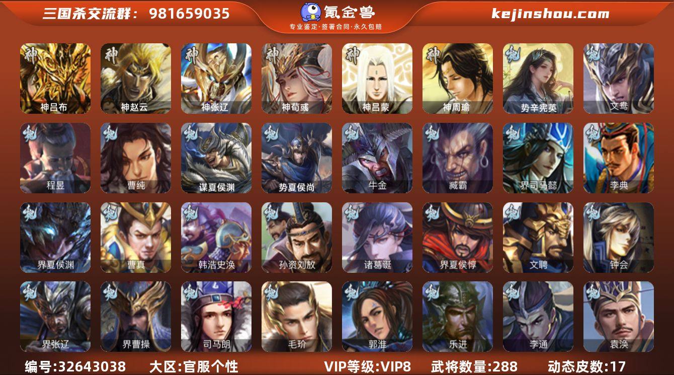 神吕布,神赵云,神张辽,神荀彧,曹纯,势辛宪英,程昱,谋赵云,张星彩,董允,界徐盛,文鸯,左慈,麹义,界左慈,界李儒,谋张角,星董卓,兀突骨,神吕蒙,神周瑜,势夏侯尚,SP关羽,SP曹仁,SP蔡文姬,乐进,曹昂,诸葛诞,朱灵,文聘,SP姜维,钟会,曹冲,郭淮,满宠,界王异,界曹操,界司马懿,界夏侯惇,界张辽,界许褚,界郭嘉,李典,曹真,韩浩史涣,陈群,曹叡,曹休,钟繇,司马朗,李通,孙资刘放,吕虔,鲁芝,蒯越蒯良,界荀彧,杜畿,界曹丕,张恭,界曹植,界满宠,界郭淮,蔡贞姬,袁涣,崔琰,毛玠,谋徐晃,谋于禁,牵招,谋夏侯渊,牛金,界夏侯渊,臧霸,唐咨,SP孙尚香,关银屏,夏侯霸,马良,关兴张苞,廖化,界马岱,关平,简雍,刘封,界法正,界关兴张苞,界刘备,界关羽,界赵云,SP徐庶,吴懿,周仓,张松,刘谌,夏侯氏,糜竺,马忠,李严,黄皓,界黄月英,界诸葛亮,赵统赵广,界庞统,胡金定,杨仪,邓芝,费祎,糜夫人,王甫赵累,界周仓,宗预,谋庞统,界张嶷,谋张飞,诸葛果,蒋琬费祎,糜芳傅士仁,甘夫人,鲁肃,凌操,大乔小乔,诸葛恪,诸葛瑾,孙鲁育,程普,韩当,潘...