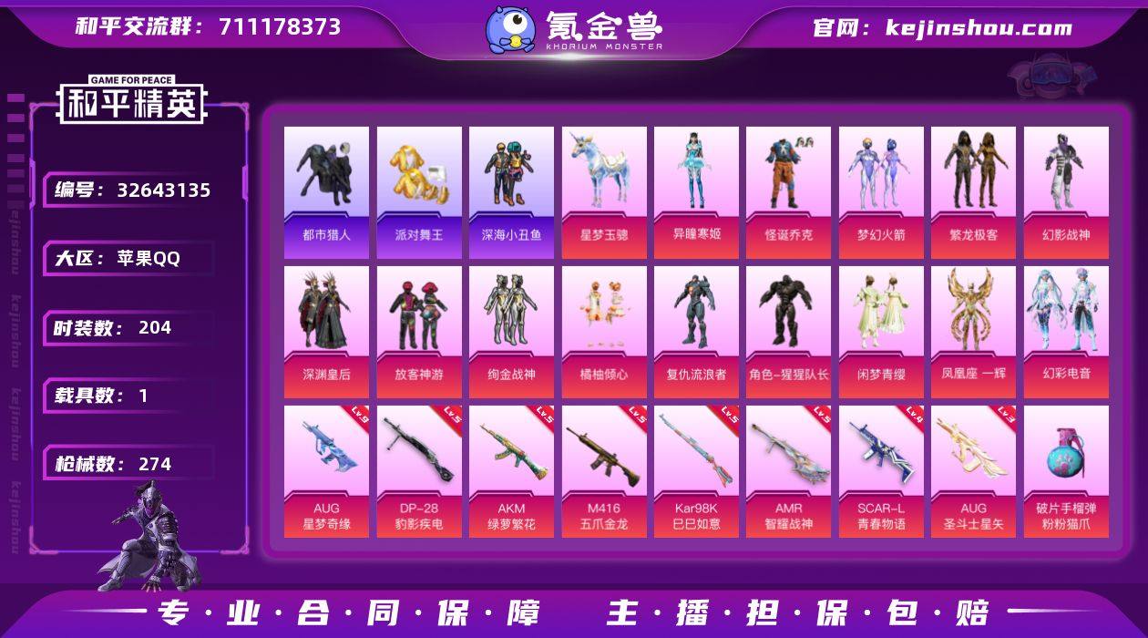 【特价出售/店主推荐】 AUG-星梦奇缘(九级)/绝世印记1 苹果 手Q-14粉装-11特效枪-1载具-5粉色飞行器-84129热力值-9王牌印记-204套装-274枪皮【热门品类】:粉装-怪诞乔克,粉装-梦幻火箭,粉装-繁龙极客,套装-浪漫天命,套装-都市猎人,套装-派对舞王,套装-深海小丑鱼,套装-小丑鱼,套装-忍者信条,套装-AG战队服,套装-龟仙人,套装-暗影哥特,套装-红红火火,角色-Mark.06,熔岩游骑兵连帽夹克【粉色套装】:粉装-幻影战神,粉装-怪诞乔克,粉装-深渊皇后,粉装-梦幻火箭,粉装-放客神游,粉装-绚金战神,粉装-橘柚倾心,角色-复仇流浪者,角色-猩猩队长,粉装-闲梦青缨,粉装-繁龙极客,角色-凤凰座 一辉,粉装-幻彩电音,角色-异瞳寒姬【粉色枪皮等级】:AKM-绿萝繁花(五级),SCAR-L-青春物语(四级),M416-五爪金龙(五级),AUG-星梦奇缘(九级),AUG-圣斗士星矢(三级),Kar98K-巳巳如意(五级),Mk14-福马献瑞(五级),AMR-智耀战神(五级),DP-28-豹影疾电(五级),燃烧瓶-薄荷可可(六级)【粉色载具】:星梦玉骢【粉色枪皮】:AKM-绿萝繁花,SCAR-L-青春物语,M416-五爪金龙,AUG-星梦奇缘,AUG-圣斗士星矢,Kar98K-巳巳如意,Mk14-福马献瑞,AMR-智耀战神,DP-28-豹影疾电...