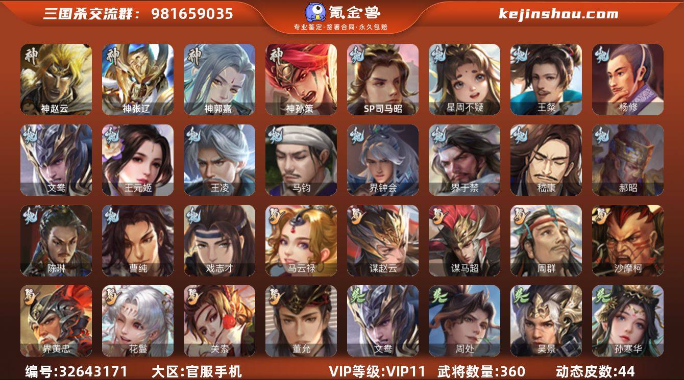 【620】官阶:大将军;VIP等级:VIP11;史诗武将数量:47;动态皮肤数量:44;武将总数:360;史诗宝珠数量:23;将魂数量:199;神将:6;魏国史诗武将:18;蜀国史诗武将:9;吴国史诗武将:8;群史诗武将:12 神赵云,神张辽,神郭嘉,神孙策,神吕蒙,神周瑜,SP司马昭,星周不疑,王粲,杨修,文鸯,王元姬,王凌,马钧,界钟会,界于禁,嵇康,郝昭,陈琳,曹纯,戏志才,关索,马云騄,谋赵云,谋马超,周群,沙摩柯,界黄忠,花鬘,董允,周处,吴景,孙寒华,骆统,留赞,界朱然,界徐盛,界步练师,左慈,张让,麹义,南华老仙,沮授,界左慈,界李儒,公孙康,张绣,李傕,阎象,许攸,神郭嘉-虎年清明(动态),神孙策-霸王再世(动态),甄姬-明珠耀躯(动态),司马懿-牛年立冬(动态),邓艾-神兵天降(动态),郝昭-死守陈仓(动态),界司马懿-牛年立冬(动态),界邓艾-神兵天降(动态),戏志才-举棋若定(动态),曹纯-虎年春节(动态),羊徽瑜-牛年中秋(动态),司马师-牛年中秋(动态),关羽-啸风从龙(动态),马超-星夜袭曹(动态),黄月英-明良千古(动态),诸葛亮-明良千古(动态),界关羽-啸风从龙(动态),界马超-星夜袭曹(动态),界诸葛亮-明良千古(动态),界黄月英-明良千古(动态),SP孙尚香-明良千古(动态),关银屏-鼠年中秋(动态),关索-虎年七夕(动态),鲍三...