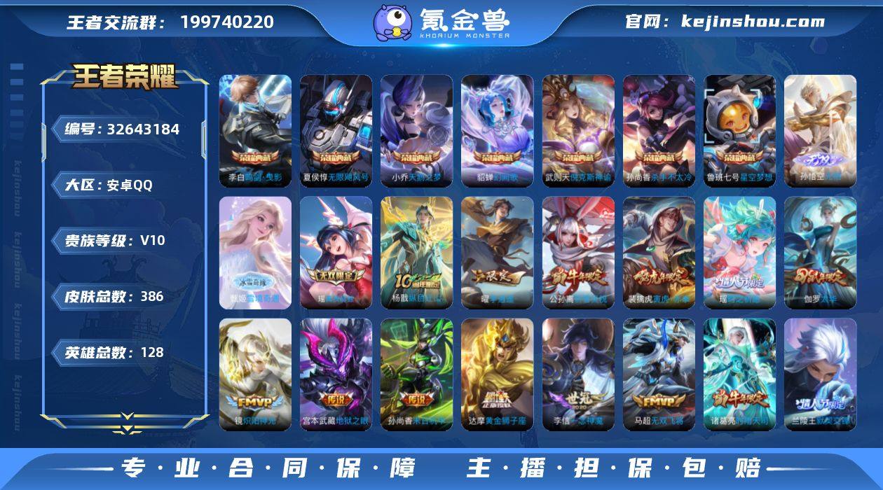 【特价出售/店主推荐】安卓Q-V10-至尊星耀IV段位-127英雄-367皮肤-7典藏皮肤-1典藏英雄-3无双-47传说-125史诗 【英雄全皮】:金蝉全皮 【荣耀典藏】:武则天英雄,武则天倪克斯神谕,夏侯惇无限飓风号,小乔天鹅之梦,孙尚香杀手不太冷,鲁班七号星空梦想,李白鸣剑曳影,貂蝉幻阙歌 【无双皮肤】:瑶真我赫兹,甄姬雪境奇遇,孙悟空无相 【传说皮肤】:杨戬纵目迁山,艾琳觅芳踪,大乔时之奇旅,吕布怒海麟威,马超无双飞将,大乔挚爱花嫁,孙策挚爱之约,露娜启示之音,蔡文姬花朝如约,女娲补天,孙策末日机甲,瑶时之祈愿,裴擒虎寅虎赤拳,鲁班七号寅虎瑞焰,孙尚香异界灵契,貂蝉遇见胡旋,赵云淬星耀世,王昭君乞巧织情,西施游龙清影,曜李逍遥 ,周瑜音你心动,小乔音你心动,李元芳飞鸢探春,兰陵王默契交锋,公孙离祈雪灵祝,诸葛亮时雨天司,镜炽阳神光,虞姬启明星使,孙悟空零号赤焰,关羽武圣,曜云鹰飞将,李信一念神魔,刘备时之恋人,伽罗太华,貂蝉猫影幻舞,张良黄金白羊座,虞姬云霓雀翎,达摩黄金狮子座,花木兰冠军飞将,梦奇胖达荣荣,后羿黄金射手座,诸葛亮武陵仙君,貂蝉仲夏夜之梦,孙尚香末日机甲,宫本武藏地狱之眼,武则天海洋之心,狄仁杰超...