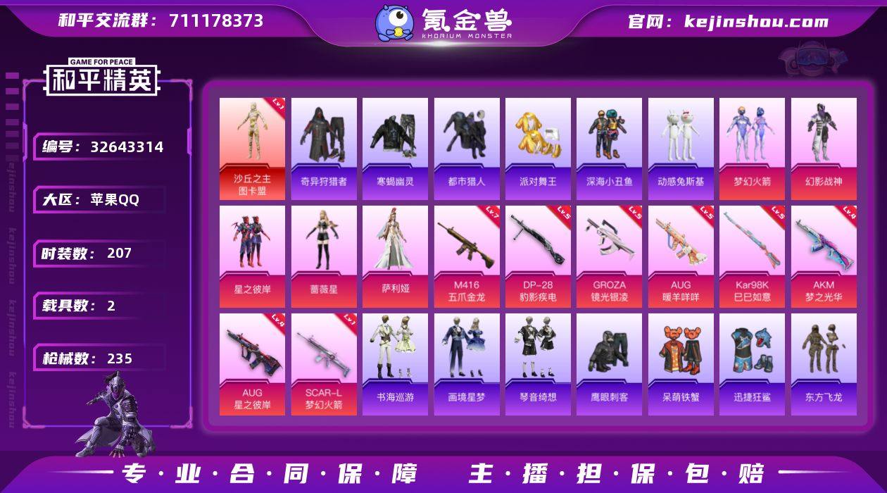 苹果 手Q-2神装-5粉装-13特效枪-2载具-4粉色飞行器-79818热力值-15王牌印记-207套装-235枪皮 【红色神装等级】:天马神君-驭风(一级),沙丘之主-图卡盟(一级) 【红色角色神装】:天马神君-驭风,沙丘之主-图卡盟 【热门品类】:粉装-梦幻火箭,套装-寒蝎幽灵,套装-浪漫天命,套装-都市猎人,套装-派对舞王,套装-深海小丑鱼,套装-小丑鱼,套装-奇异狩猎者,套装-金羽特工,套装-忍者信条,套装-动感兔斯基人偶服,套装-龟仙人,套装-暗影哥特,套装-粉红小猪 【粉色套装】:粉装-幻影战神,粉装-梦幻火箭,粉装-星之彼岸,角色-蔷薇星,角色-萨利娅 【粉色枪皮等级】:AKM-梦之光华(四级),SCAR-L-梦幻火箭(一级),SCAR-L-灵驹仙姬(三级),M416-五爪金龙(七级),M416-天马神君(一级),GROZA-镜光银凌(五级),AUG-星之彼岸(四级),AUG-暖羊咩咩(五级),UMP45-萌骑冒险(二级),AKS-74U-森灵之息(五级),Kar98K-巳巳如意(五级),Mk14-福马献瑞(五级),DP-28-豹影疾电(五级) 【粉色载具】:法拉利Roma(赛车红),凌风神骏 【粉色枪皮】:AKM-梦之光华,SCAR-L-梦幻火箭,SCAR-L-灵驹仙姬,M416-五爪金龙,M416-天马神君,GROZA-镜光银凌,AUG-星之彼岸,AUG-暖羊咩咩,UMP45-萌...
