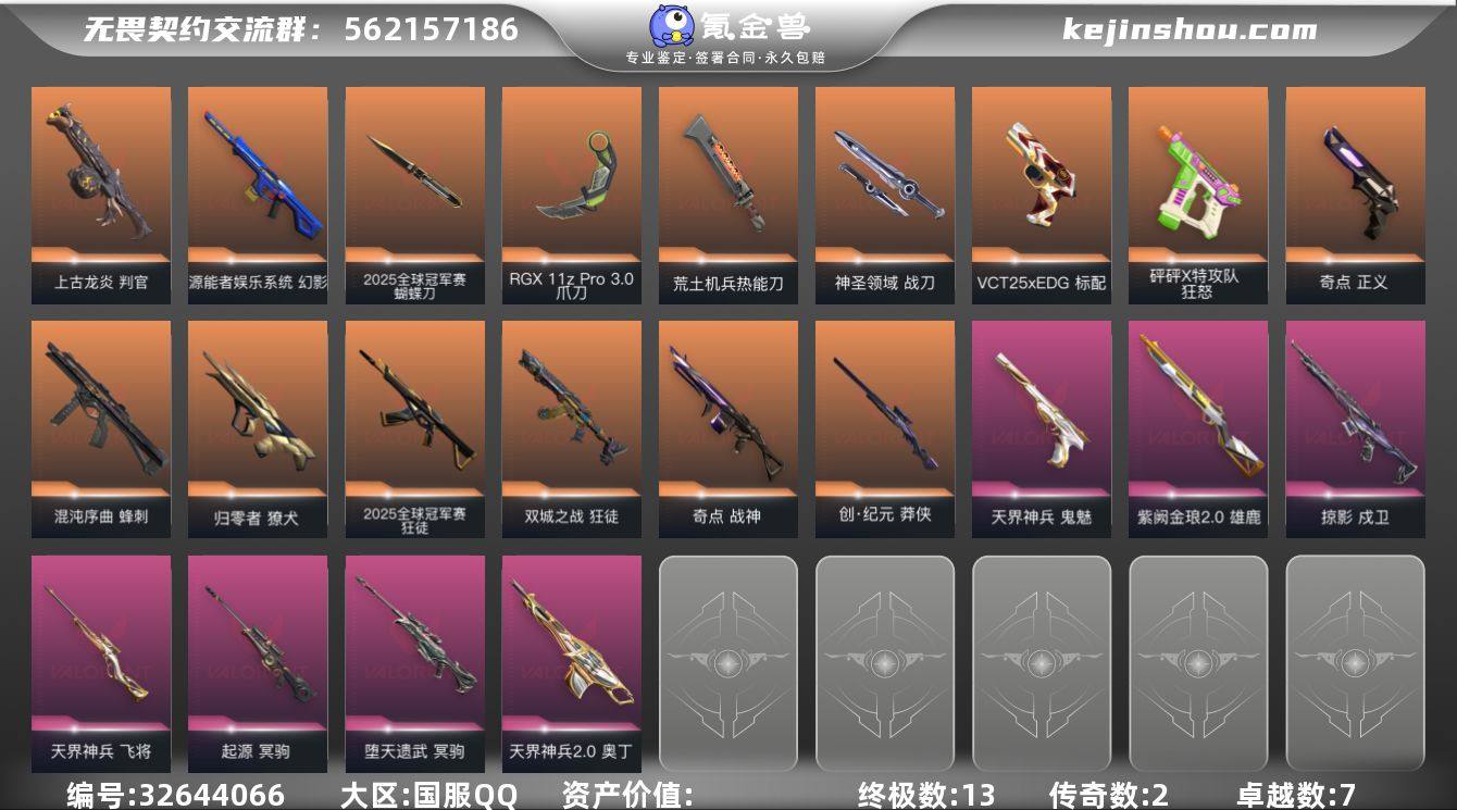【939757】【套装】:2025全球冠军赛套装 【英雄】:幻棱,炼狱,维斯,暮蝶,钛狐,壹决,铁臂,捷风,雷兹,幽影,不死鸟,贤者,猎枭,蝰蛇,零,芮娜,奇乐,尚勃勒,霓虹,斯凯,夜露,K/O,海神,盖可,黑梦,钢锁 【近战武器】:近战武器-2025全球冠军赛 蝴蝶刀,近战武器-RGX 11z Pro//3.0 爪刀,近战武器-荒土机兵 热能刀,近战武器-神圣领域 战刀 【狂徒】:狂徒-2025全球冠军赛,狂徒-双城之战,狂徒-荒土机兵 【幻影】:幻影-源能者娱乐系统,幻影-神圣领域,幻影-纳米打击 【戍卫】:戍卫-掠影,戍卫-逆冲蛮牛,戍卫-月球哨兵 【獠犬】:獠犬-归零者,獠犬-神圣领域,獠犬-逆冲蛮牛 【冥驹】:冥驹-堕天遗武,冥驹-起源,冥驹-荒土机兵,冥驹-星云暗涌 【飞将】:飞将-天界神兵 【莽侠】:莽侠-创·纪元,莽侠-月球哨兵 【战神】:战神-奇点,战神-神圣领域 【奥丁】:奥丁-天界神兵//2.0,奥丁-纳米打击 【判官】:判官-上古龙炎,判官-纳米打击x 【雄鹿】:雄鹿-紫阙金琅//2.0,雄鹿-逆冲蛮牛,雄鹿-月球哨兵 【骇灵】:骇灵-荒土机兵,骇灵-星云暗涌 【蜂刺】:蜂刺-混沌序曲,蜂刺-星云暗涌 【标配】:标配-荒土机兵 【VCT手枪】:标配-VCT25 x EDG 【正义】...