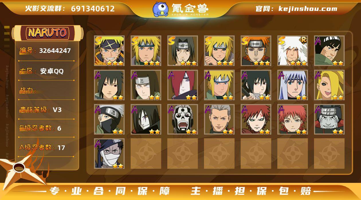 实名: 不可修改 贵族等级: V3 S忍数: 6 A忍数: 17 亮点: 【XY323】V3/S忍6/A忍17/三星S-自来也「舞之豪杰」/二星A-日向宁次·忍界大战/二星A-旗木卡卡西「忍界大战」/二星A-我爱罗「疾风传」/二星A-飞段「死司凭血」/二星A-长门「青年」/二星A-桃地再不斩/2星小南「神驹佑将」/二星A-迪达拉「秽土转生」/二星A-蝎/三星S-佩恩「天道」/二星A-飞段/三星S-漩涡鸣人·宇智波佐助/三星S-波风水门/二星A-加藤断/二星A-宇智波泉奈/三星S-波风水门「秽土转生」/二星A-干柿鬼鲛/二星A-迈特凯「青春爆炸」/二星A-宇智波佐助「须佐能乎」/二星A-大蛇丸「晓」/三星S-宇智波鼬 「须佐能乎」/二星A-波风水门 「青年」