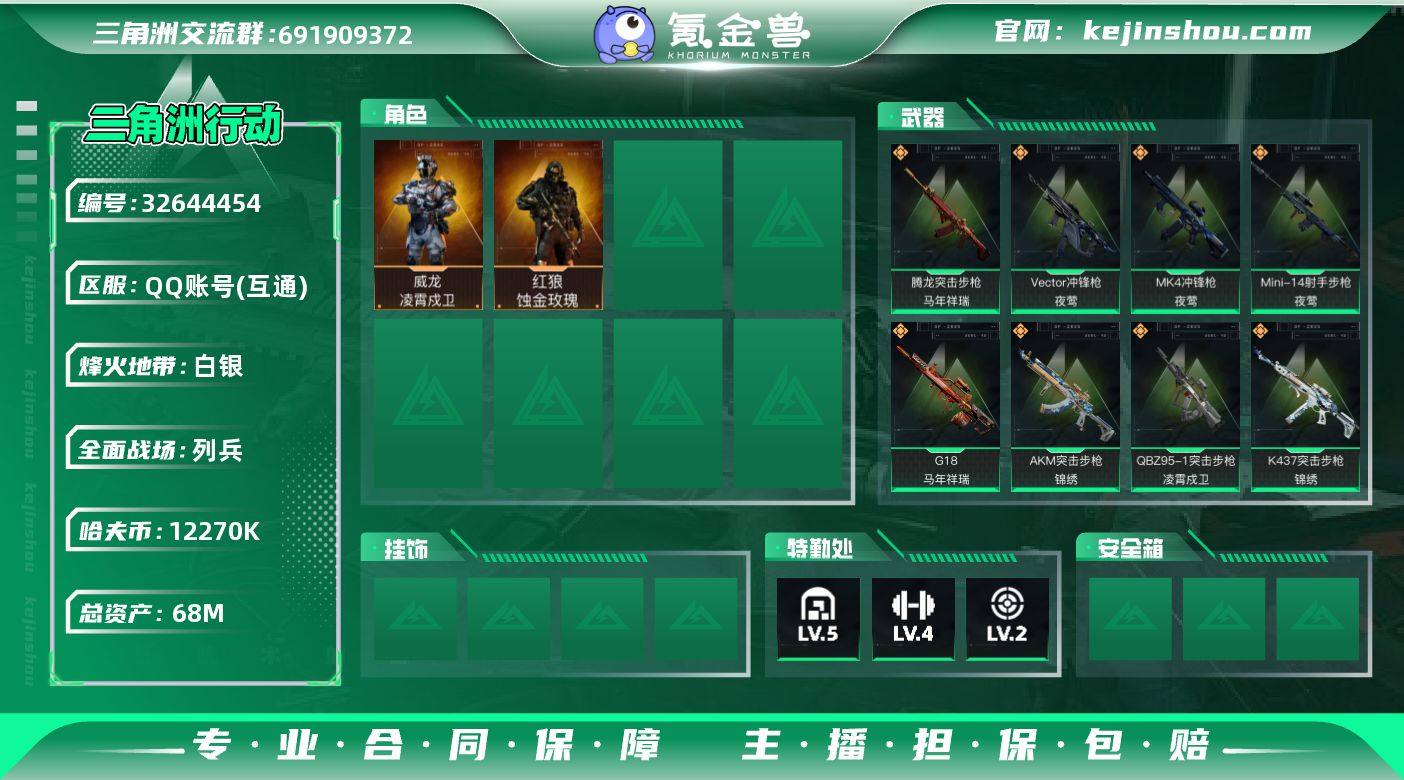 【939767】68m总资产-12270k哈夫币-39烽火等级-白银-19战场等级-列兵 【干员外观】:红狼-蚀金玫瑰,威龙-凌霄戍卫,蛊-不羁人生 【近战皮肤】:近战-黑鹰 【传说外观】:M4A1突击步枪-蚀金玫瑰,AKM突击步枪-锦绣,QBZ95-1突击步枪-凌霄戍卫,AUG突击步枪-悠然茶歇,腾龙突击步枪-马年祥瑞,K437突击步枪-锦绣,MK47突击步枪-悠然茶歇,Vector冲锋枪-夜莺,UZI冲锋枪-悠然茶歇,SMG-45冲锋枪-锦绣,QCQ171冲锋枪-不羁人生,MK4冲锋枪-夜莺,Mini-14射手步枪-夜莺,M14射手步枪-缄花,SR-25射手步枪-缄花,.357左轮-缄花,G18-马年祥瑞 【史诗外观】:SMG-45冲锋枪-阿萨拉特攻,MP7冲锋枪-六套之力 【稀有外观】:QJB201轻机枪-千里骏骨,SG552突击步枪-2026, AK-12突击步枪-马年新春,SCAR-H战斗步枪-荣耀列队,SMG-45冲锋枪-行动开启,SMG-45冲锋枪-幻影结构,勇士冲锋枪-冰天雪地,M249轻机枪-冰天雪地,SR-25射手步枪-开拓,QSZ92G-一帆风顺 【普通外观】:M4A1突击步枪-高雅黑,QBZ95-1突击步枪-高雅黑,QBZ95-1突击步枪-海浪,QBZ95-1突击步枪-海色,QBZ95-1突击步枪-2026,K416突击步枪-几何迷彩,M16A4突击步枪-高雅黑,AUG突击步枪-浅蓝涂装,M7战斗步枪-黑巧甜心,...