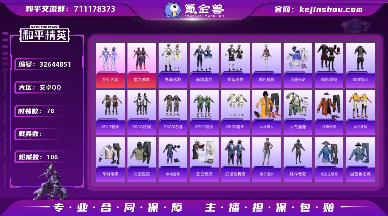 精品号2粉2特 梦幻火箭 安卓 手Q-2粉装-2特效枪-0载具-2粉色飞行器-33485热力值-3王牌印记-78套装-106枪皮 【热门品类】:粉装-梦幻火箭,套装-浪漫天命,套装-暗影哥特 【粉色套装】:粉装-梦幻火箭,粉装-星之彼岸 【粉色枪皮等级】:UMP45-萌骑冒险(三级),Mk14-福马献瑞(五级) 【粉色枪皮】:UMP45-萌骑冒险,Mk14-福马献瑞 【粉色飞行器】:炫彩糖果飞行器,梦幻火箭飞行器 【粉色降落伞】:星之彼岸降落伞,暗夜玫瑰降落伞,炫彩糖果降落伞 【稀有套装】:套装-雪国风尚,套装-炫彩糖果,套装-马上有钱,角色-绯色魅影,套装-书海巡游,套装-画境星梦,套装-琴音绮想,套装-雨过天青,套装-红釉青花,角色-皓月伶影 【稀有枪皮】:AUG-冰晶雪宝,AKM-星之彼岸,AKM-破晓战魂,AKM-虎虎生威,M16A4-蓝色火焰,SCAR-L-暗夜玫瑰,SCAR-L-玉兔迎春,M416-红色方程式,GROZA-异彩先驱,GROZA-蓝莓炮弹,GROZA-黑色刀锋,AUG-甜蜜菠萝,AUG-耀粉歌者,M762-拳皇97,M762-瑞龙福将,蜜獾-垂柳戏鸭,蜜獾-娇憨猪猪,ACE32-画境星梦,UZI-娇憨猪猪,UZI-炫彩节奏,UMP45-春暖花开,UMP45-蓝色火焰,Vector-彩虹符号,Vector-生命誓言,汤姆逊-天降萌叽,汤姆逊-异彩先驱,汤姆逊...