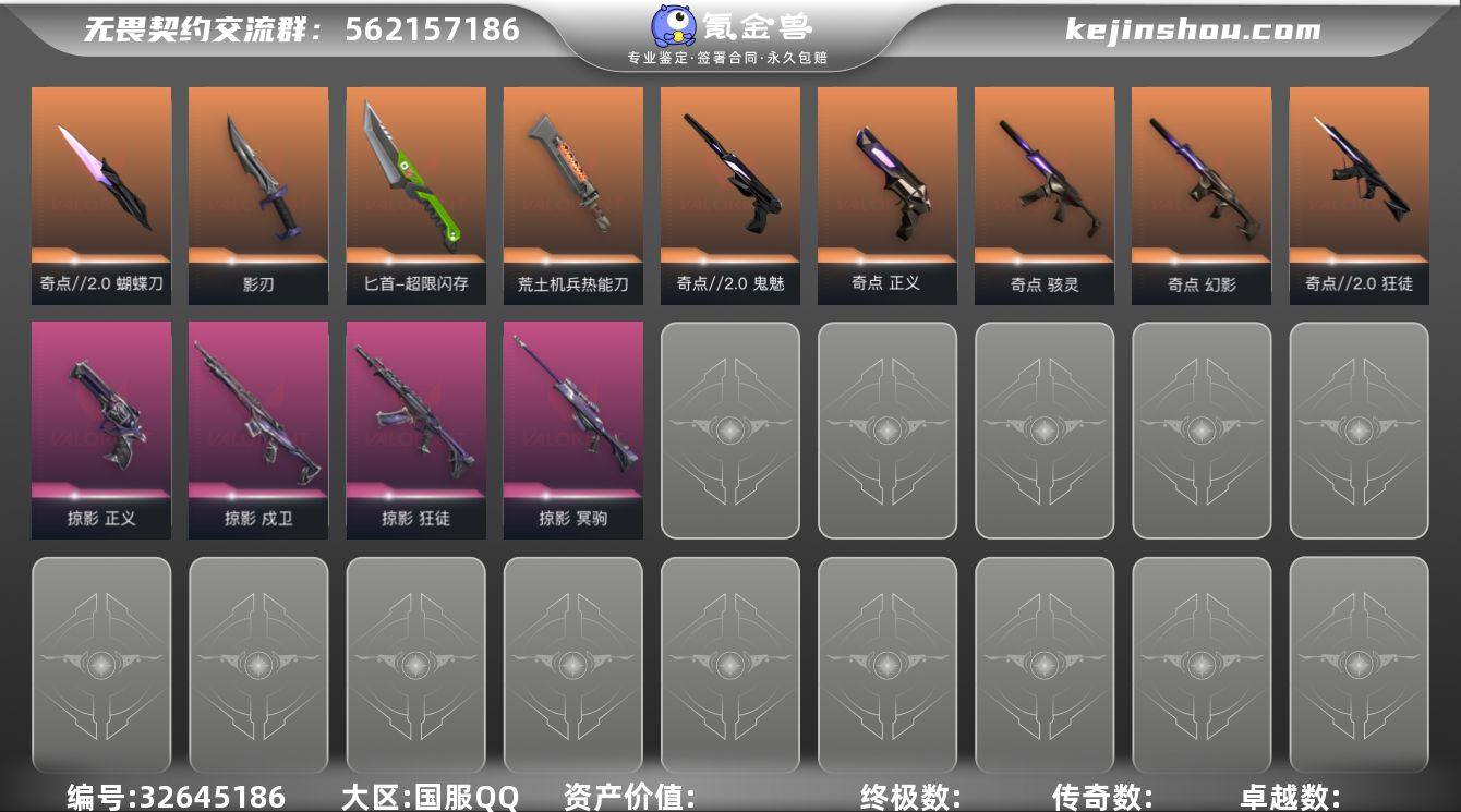 【蝴蝶刀 2热门套装】精品手慢无系列!【可秒换绑 自带包赔】Q194164 (奇点2.0套装/掠影套装)无畏契约/等级52/段位铂金/英雄11/皮肤37/资产18870/已使用R点515/剩余R点5/奇点//2.0-狂徒,奇点//2.0-鬼魅,奇点//2.0-蝴蝶刀,掠影-狂徒,掠影-冥驹,掠影-戍卫,掠影-正义,影刃,荒土机兵-热能刀,超限闪存-匕首,奇点-幻影,奇点-骇灵,奇点-正义