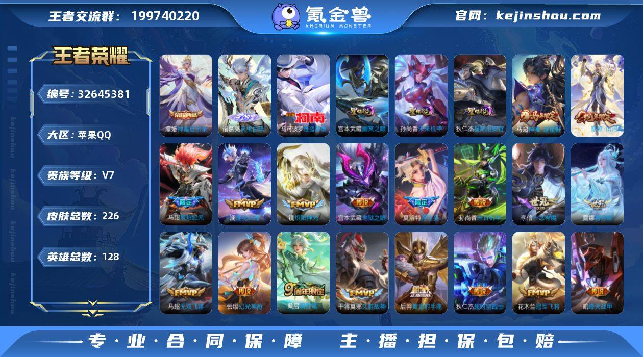 【小国标李信】【金标孙尚香 金标马超 金标夏洛特 金标马可波罗 金标澜】贵族等级: V7 英雄数: 128 皮肤数: 226 荣耀水晶: 神鉴启示录 无双皮: 天机白泽 珍品传说: 怪盗基德 星传说: 未来机甲,幽冥之眼,星际治安官 传说皮: 黄金射手座,冠军飞将,绛天战甲,久胜战神,炽阳神光,一念神魔,末日机甲-孙尚香,地狱之眼,超时空战士-狄仁杰,无双飞将,浮生妄,霜月吟,澜逐花归海,琥珀纪元马超,幻光神枪,神骥·逐星野 限定皮: 至尊宝,鸣野蒿,愿照·山河定