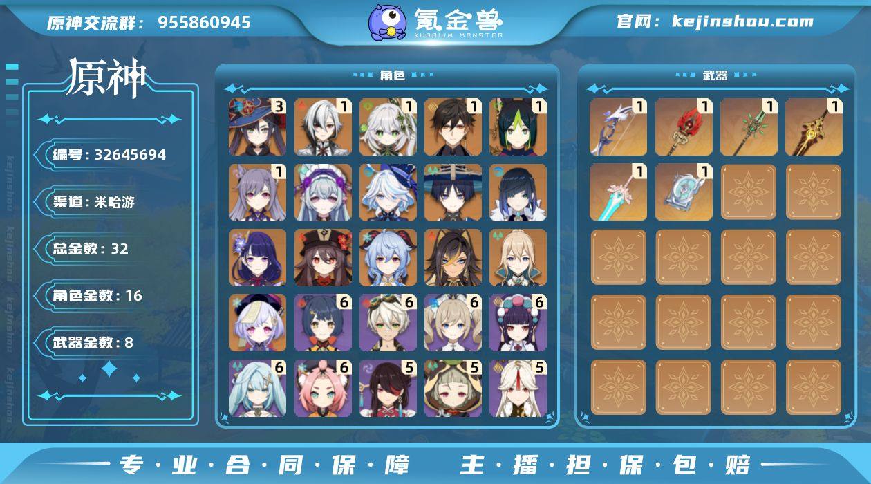 邮箱: 未绑定 总黄数: 32 冒险等级: 57 3命金色角色: 三命莫娜 1命金色角色: 一命刻晴,一命钟离,一命提纳里,一命纳西妲,一命阿蕾奇诺 0命金色角色: 七七,琴,甘雨,胡桃,雷电将军,夜兰,流浪者,迪希雅,芙宁娜,梦见月瑞希 拥有武器: 四风原典,和璞鸢,天空之傲,护摩之杖,若水,苇海信标 1精武器: 四风原典,和璞鸢,天空之傲,护摩之杖,若水,苇海信标