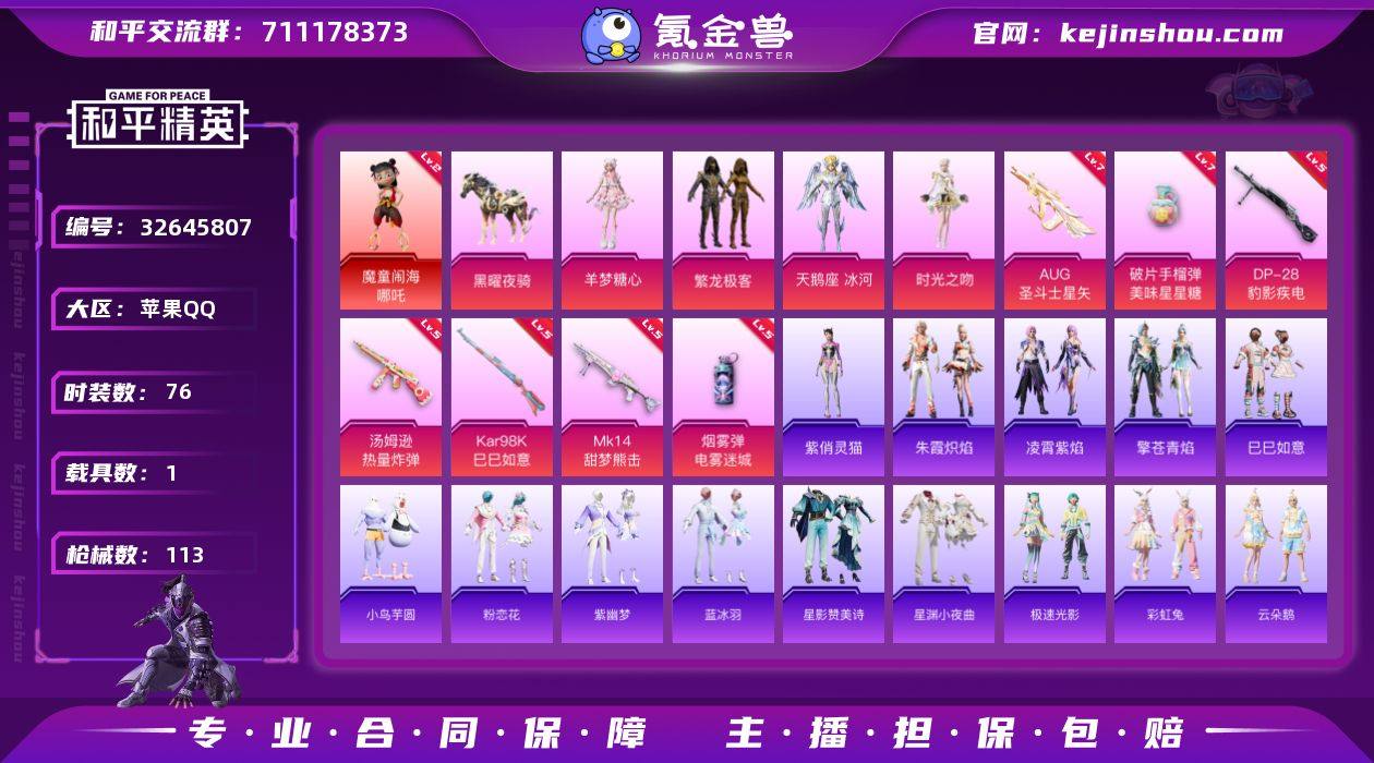 精品号1红4粉7特1载具 2级哪吒 苹果 手Q-1神装-4粉装-7特效枪-1载具-4粉色飞行器-35995热力值-3王牌印记-76套装-113枪皮 【红色神装等级】:魔童闹海-哪吒(二级) 【红色角色神装】:魔童闹海-哪吒 【热门品类】:粉装-繁龙极客 【粉色套装】:粉装-繁龙极客,角色-天鹅座 冰河,角色-时光之吻,角色-羊梦糖心 【粉色枪皮等级】:AUG-圣斗士星矢(七级),汤姆逊-热量炸弹(五级),Kar98K-巳巳如意(五级),Mk14-甜梦熊击(五级),DP-28-豹影疾电(五级),烟雾弹-电雾迷城(五级),破片手榴弹-美味星星糖(七级) 【粉色载具】:黑曜夜骑 【粉色枪皮】:AUG-圣斗士星矢,汤姆逊-热量炸弹,Kar98K-巳巳如意,Mk14-甜梦熊击,DP-28-豹影疾电,烟雾弹-电雾迷城,破片手榴弹-美味星星糖 【粉色飞行器】:炫彩糖果飞行器,繁龙极客飞行器,时光之誓飞行器,灵猫魔法师飞行器 【粉色降落伞】:环太平洋降落伞,月影灵韵降落伞,幻彩电音降落伞,灵猫魔法师降落伞,炫彩糖果降落伞 【稀有套装】:套装-巳巳如意,套装-小鸟芋圆,套装-炫彩糖果,套装-粉恋花,套装-紫幽梦,套装-蓝冰羽,套装-星影赞美诗,套装-星渊小夜曲,套装-极速光影,套装-彩虹兔,套装-云朵鹅,套装-雪绒豹,套装-混沌火...