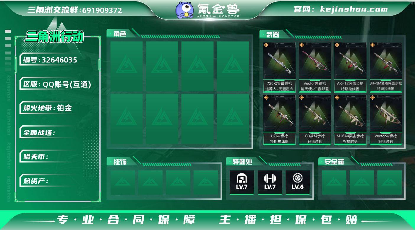 总资产:125M 1干员外观 2近战传说 39传说枪械 哈夫币:4.842K 不可修改实名 【烽火地带段位】铂金 【全面战场段位】无段位 【干员外观】红狼-电锯惊魂 【传说武器皮肤】近战武器-处刑者,近战-信条,P90冲锋枪-信条,SR-25射手步枪-信条,AK-12突击步枪-特斯拉线圈,SR-3M紧凑突击步枪-特斯拉线圈,UZI冲锋枪-特斯拉线圈,勇士冲锋枪-能天使-午夜邮差,Vector冲锋枪-能天使-午夜邮差,SCAR-H战斗步枪-启航,ASh-12战斗步枪-鹅鸭杀,QCQ171冲锋枪-鹅鸭杀,QJB201轻机枪-鹅鸭杀,KC17突击步枪-电锯惊魂,SG552突击步枪-运动员,AWM狙击步枪-万金泪冠,.357左轮-缄花,SR-25射手步枪-缄花,M14射手步枪-缄花,勇士冲锋枪-万金泪冠,47突击步枪-悠然茶歇,AUG突击步枪-悠然茶歇,UZI冲锋枪-悠然茶歇,腾龙突击步枪-万金泪冠,Mini-14射手步枪-夜莺,SKS射手步枪-骑士,G3战斗步枪-狩猎时刻,4冲锋枪-夜莺,M14射手步枪-蛮荒,腾龙突击步枪-马年祥瑞,G18-马年祥瑞,Vector冲锋枪-夜莺,M16A4突击步枪-狩猎时刻,Vector冲锋枪-狩猎时刻,M4A1突击步枪-蚀金玫瑰,725双管霰弹枪-送葬人-无题密令,M4A1突击步枪-阿米娅,CAR-15突击步枪-阿米娅,复合弓-黑-天际线