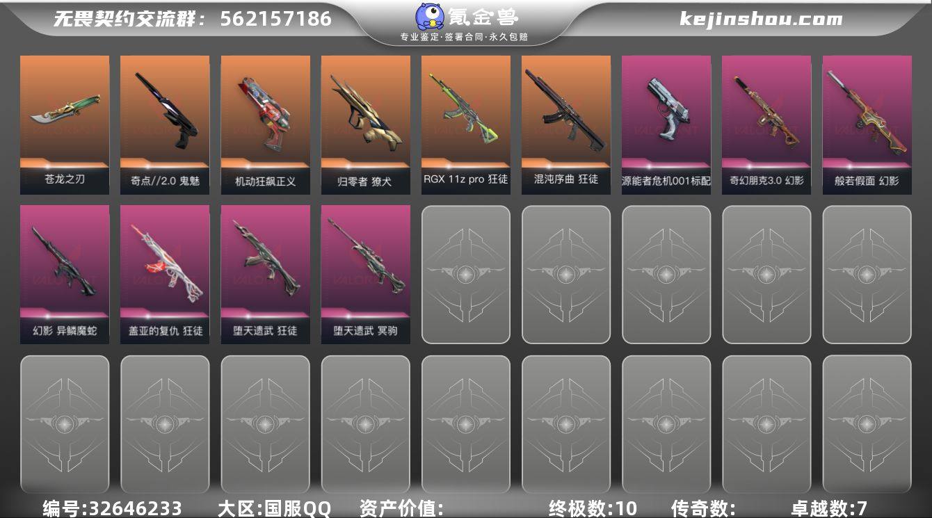 【939847】【英雄】:幻棱,炼狱,维斯,暮蝶,钛狐,壹决,铁臂,捷风,雷兹,幽影,不死鸟,贤者,猎枭,蝰蛇,零,芮娜,奇乐,尚勃勒,霓虹,斯凯,夜露,星礈,K/O,海神,盖可,黑梦,钢锁 【近战武器】:近战武器-碎心裂刃,近战武器-5周年//公测重制版 苍龙之刃,近战武器-神之刃,近战武器-紫金爪刀 【狂徒】:狂徒-混沌序曲,狂徒-RGX 11z Pro,狂徒-堕天遗武,狂徒-盖亚的复仇 【幻影】:幻影-般若假面,幻影-异鳞魔蛇,幻影-奇幻朋克//3.0 【獠犬】:獠犬-归零者 【冥驹】:冥驹-堕天遗武 【骇灵】:骇灵-无限竞技 【标配】:标配-源能者危机001 【正义】:正义-机动狂飙,正义-纳米打击,正义-游戏结束 【鬼魅】:鬼魅-奇点//2.0,鬼魅-诡秘蛇影,鬼魅-星云暗涌 【卡面】:终章:激斗汉堡 卡面,进入射程 卡面,《双城之战》拥抱 卡面,精灵大战 卡面,欢迎来到底城 卡面,南瓜盛典 卡面,排除故障 卡面,正义的化身 卡面,红鳞松叶 卡面,无畏契约GO!第一卷:芮娜 卡面,无畏契约GO!第一卷:零 卡面,无垠星环 卡面,《双城之战》金克丝 卡面,同步耍酷 卡面,别冒尖 卡面,"Luie" 卡面,代号红色 卡面,新兵报到 卡面,V契约 卡面,无畏契约 卡面 【喷漆】:...