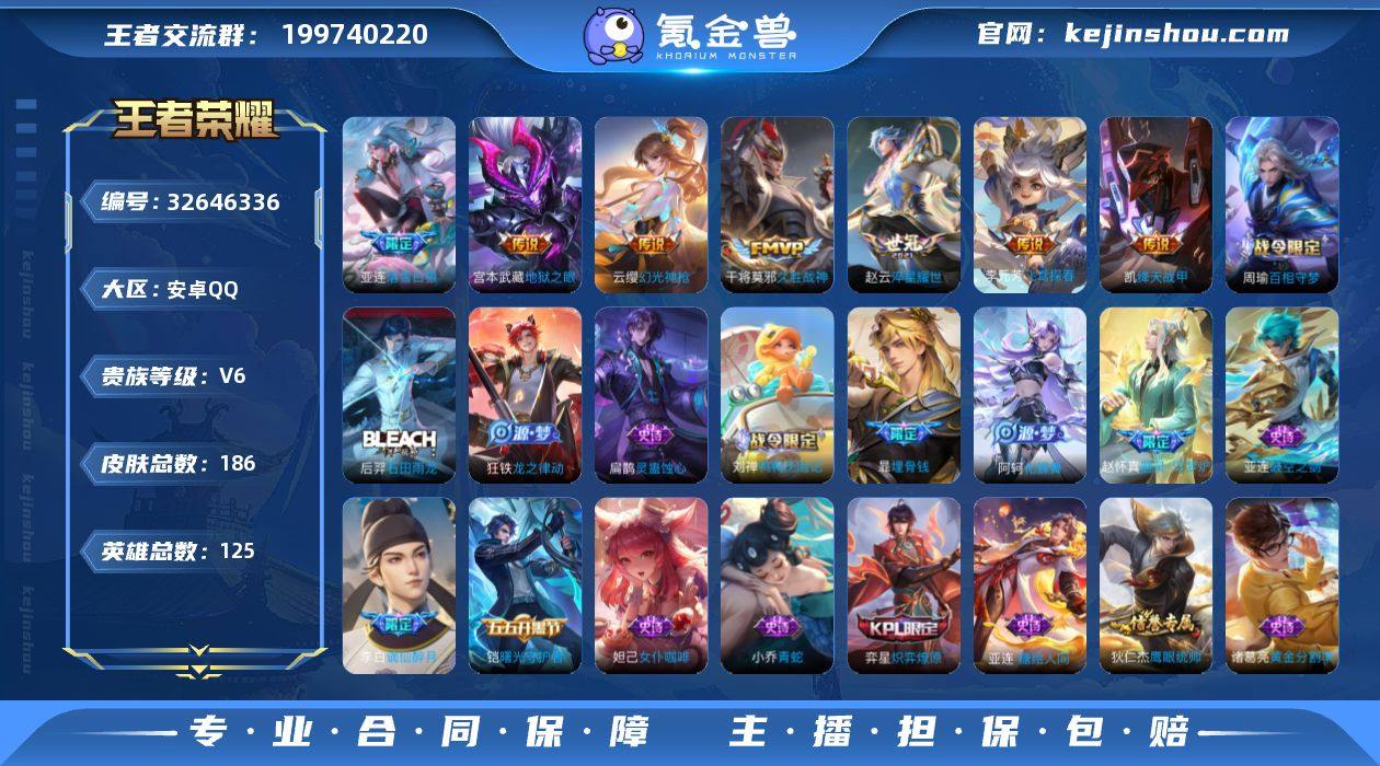 [17907115]V6 1珍品传说 12传说 125英雄 186皮肤 可修改实名 男号 【英雄全皮】空空儿全皮,孙权全皮,蚩奼全皮,亚连全皮 【稀有英雄】大司命,韩信(韩跳跳),夏洛特(夏师傅),艾琳,橘右京(橘子),娜可露露(鸟人),不知火舞,赵云,金蝉(唐僧),戈娅 【珍品传说】兔狲·蓬尾 【传说皮】典韦战鼓燎原,落雪白狼,幻光神枪,神树通天,地狱之眼,末日机甲-孙尚香(绿蚂蚱),淬星耀世,久胜战神,飞鸢探春,绛天战甲(鸡嘴战神) 【珍宝阁皮】妄想食味,女武神 【赛季/战令皮】噬灭天穹(s37),古海寻踪(s33),海盐诗旅(s30),擒涛扼浪(s31),探海日志(s32),剑破天穹(s35),天穹祈灯(s34),青焰无极,苍威无极,天穹之誓(s36),蔡文姬夏日便利店,虞姬夏日便利店,潮玩骑士王 【史诗皮】谪仙醉月,破空之剑,炽弈燎原,星界战将,糖绘人间,蒙犽顽岩魄,埋骨钱,器灵·浮梦炉,化蝶舞,织梦人,线条小狗-周瑜,九幽镇关,巫礼祀神,万灵启世,鸭鸭历险记-刘禅,百相守梦-周瑜,灵蛊蚀心,龙之律动,石田雨龙,百相守梦-黄忠,黄金分割率,特工魅影,江河有灵,蒙恬荣光圣徽,冰冠公主,青蛇,偶像歌手,猫狗日记-孙策,猫狗日记-大乔,乱世虎臣,节奏热浪,女仆咖啡,水果甜心,绅士熊喵,时之奇旅-安琪拉,功夫厨神,暗隐猎兽者,鬼剑武藏,心灵战警,逐浪之...