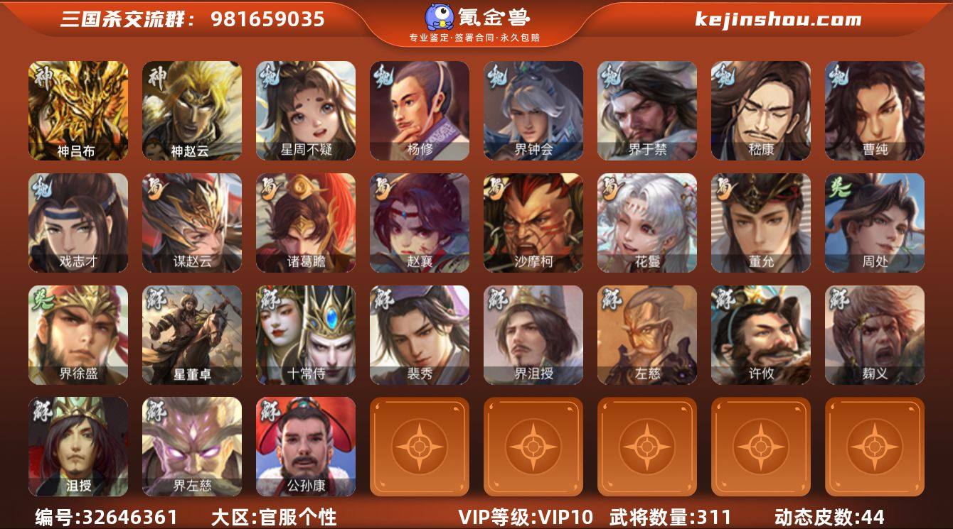 【972】官阶:骠骑将军;VIP等级:VIP10;史诗武将数量:29;动态皮肤数量:44;武将总数:311;史诗宝珠数量:22;将魂数量:1190;神将:4;魏国史诗武将:20;蜀国史诗武将:6;吴国史诗武将:2;群史诗武将:12