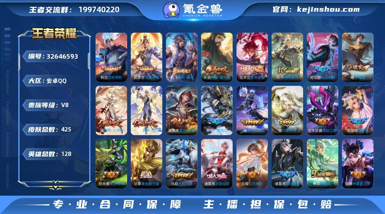 实名: 可修改 性别: 男号 贵族等级: V8 英雄数: 128 皮肤数: 425 荣耀水晶: 九霄神辉,弑枪猎影 珍品传说: 兔狲·蓬尾 传说皮: 黄金狮子座,黄金射手座,冠军飞将,久胜战神,炽阳神光,云霓雀翎,末日机甲-孙尚香,地狱火,仲夏夜之梦,零号·赤焰,海洋之心,地狱之眼,飞鸢探春,李逍遥,无双飞将,浮生妄,鹤羽星尊,澜逐花归海,幻光神枪,九山相柳,神树通天,神骥·镇沧海,异界灵契-花木兰 限定皮: 遇见飞天,李小龙,梁祝,龙胆,神威,蜜橘之夏,青龙志,朱雀志,至尊宝,武陵仙君,大圣娶亲,寅虎·瑞焰,高山流水,孙行者,傲雪梅枪,寅虎·赤拳,匿光决锋者,五谷丰年,诗剑行,山海·玄木吟,夏侯惇霜北刀,鸣野蒿,逐霄战戟,愿照·山河定,愿照·九州拓 亮点: 【优质装备】:九霄神辉(木兰典藏),弑枪猎影(韩信典藏),黄金狮子座,黄金射手座,冠军飞将,久胜战神,炽阳神光,云霓雀翎,末日机甲-孙尚香(绿蚂蚱),地狱火,仲夏夜之梦(大飞蛾),零号·赤焰,海洋之心,地狱之眼,飞鸢探春,李逍遥,无双飞将,浮生妄,鹤羽星尊,澜逐花归海,涂山容容