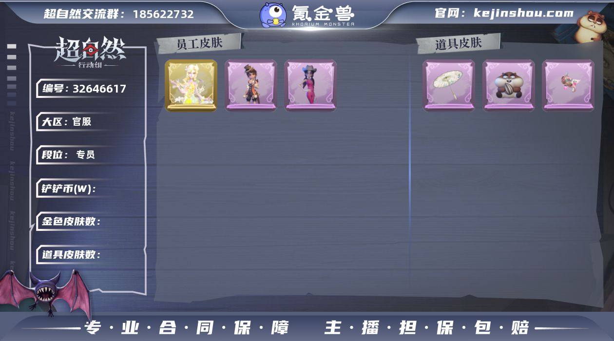 金皮1;紫皮6;道具皮4;皮肤:小黄-遗失的童话,阿念-庆宴绮愿,爱丽丝-丝缕哀歌,小黄-呱呱雨衣,巫铃儿-素影瑶光,爱丽丝-耀眼的你,阿念-王子与骑士;道具:摸金符-花落精绝,急救包-蔷薇物语,转轮手枪-新星时代,短管猎枪-星光的裁决;饰品:头饰-嘻嘻头套,头饰-鱼头怪头套,头饰-驼半仙头套,头饰-滑稽头套,头饰-呆滞头套,头饰-火爆了头套,头饰-卑微头套,头饰-萨卡班甲鱼头套,头饰-芝麻糊汤圆,头饰-太空鲨头套,头饰-小狗蛇点点头套,头饰-马上有钱,头饰-咬咬鲨头套,头饰-烈焰红唇头套,头饰-面具马头套,头饰-炙热烧烤,头饰-哈士奇头套,头饰-烛光纪念,头饰-伤心蛙头套,头饰-像素朋克墨镜,头饰-粽小宝头套,头饰-哞哞牛头套,头饰-后室幸存者头套,挂饰-未竟乐园,挂饰-天使消失的年代,背饰-毛球夹子,背饰-牛啤背包;动作:动作-心跳摇,动作-舞台中心,动作-新年摇,动作-星奇摇,动作-拜年,动作-律动迪斯科,动作-抬手,动作-举牌;工牌背景:工牌背景-蓝海奇遇,工牌背景-圣光之誓;工牌动作:工牌动作-虔诚之姿;员工:巫铃儿,员工-零,员工-兰,员工-小黄,员工-小满,员工-阿念,员工-爱丽丝,员工-莉莉,员工-逍遥,员工-爱德华,员工-临云,员工-薇薇安,员工-艾伦;累充158元;铲铲币204.3万;金砖0...