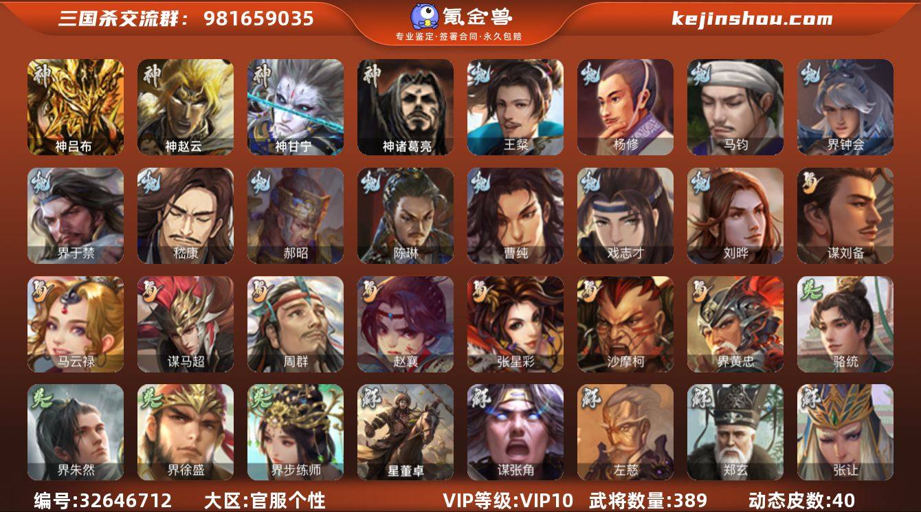 【1078】官阶:大将军;VIP等级:VIP10;史诗武将数量:41;动态皮肤数量:40;武将总数:389;史诗宝珠数量:0;将魂数量:0;神将:6;魏国史诗武将:21;蜀国史诗武将:8;吴国史诗武将:4;群史诗武将:14
