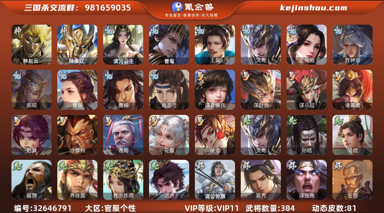 神赵云,神张辽,神吕蒙,神周瑜,曹髦,王粲,文鸯,王元姬,界钟会,郝昭,曹婴,曹纯,戏志才,清河公主,关索,谋夏侯氏,谋赵云,谋马超,诸葛瞻,赵襄,沙摩柯,谯周,花鬘,孙皓,骆统,留赞,界徐盛,界步练师,贺齐,谋黄月英,谋公孙瓒,裴秀,左慈,郑玄,张让,星黄忠,星甘宁,苏飞,麹义,庞德公,南华老仙,沮授,界左慈,界李儒,公孙康,杜预,鲍信,谋张角,张绣,李傕,阎象,许攸,友徐庶,神太史慈-勇撼日月(动态),神张辽-散敌擒孙,神甘宁-万人辟易(动态),神赵云-战龙在野(动态),钟会-龙年端午(动态),钟会-潜蛟觊天(动态),SP蔡文姬-兔年冬日(动态),甄姬-牛年清明(动态),荀彧-驱虎吞狼(动态),邓艾-神兵天降(动态),界邓艾-神兵天降(动态),于禁-威严毅重(动态),戏志才-举棋若定(动态),曹婴-锋芒毕露(动态),曹纯-虎年春节(动态),王元姬-鼠年冬至(动态),清河公主-魅影萦心(动态),花鬘-依心缱绻(动态),诸葛亮-龙年限定(动态),费祎-安民护祚(动态),刘备-明良千古(动态),关羽-明良千古(动态),马超-虎年冬至(动态),...