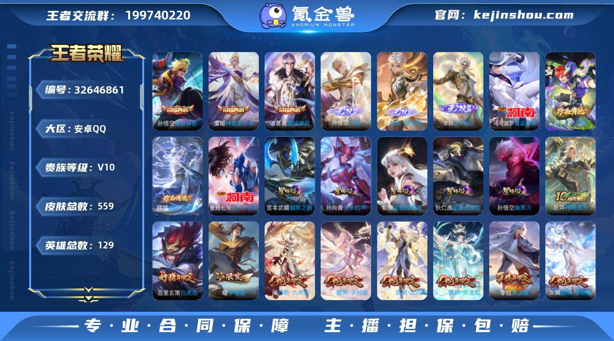 "猴子无双!曜无双!李白无双!怪盗基德!4珍品!满蛇年!裴擒虎fmvp!澜全皮!白虎志!神奇女侠!至尊宝!251皮肤戳戳!财神纳福天幕!467玫瑰!水晶268幸运值!【店长推荐 特价出售 永久包赔】js1686-安卓Q-V10-最强王者段位-129英雄-559皮肤-3典藏皮肤-1典藏英雄-3无双-4珍品传说-73传说-238限定-5星元幽冥火 幽冥之眼 星际治安官 未来机甲 金色仲夏夜-181史诗 【英雄全皮·23】:廉颇全皮,嬴政全皮,扁鹊全皮,刘邦全皮,孙权全皮,娜可露露全皮,橘右京全皮,苍全皮,女娲全皮,哪吒全皮,太乙真人全皮,鬼谷子全皮,百里玄策全皮,狂铁全皮,孙策全皮,亚连全皮,嫦娥全皮,敖隐全皮,澜全皮,桑启全皮,司空震全皮,空空儿全皮,海诺全皮 【荣耀典藏·4】:武则天英雄,孙悟空全息碎影,诸葛亮星域神启,虞姬神鉴启示录 【无双皮肤·3】:孙悟空无相,曜器灵螭龙剑,李白碎月剑心 【珍品传说·4】:嫦娥器灵落星盏,孙策时之奇旅,鲁班七号江户川柯南,马可波罗怪盗基德 【传说皮肤·73】:后羿神树通天,西施续相思,杨玉环星之鸣奏,后羿千劫归真,司空震愿照山河定,女娲愿照千秋盛,妲己愿照众生和,澜愿照九州拓,蔡文姬愿照福禄聚,虞姬愿照岁时盈,云缨幻光神...