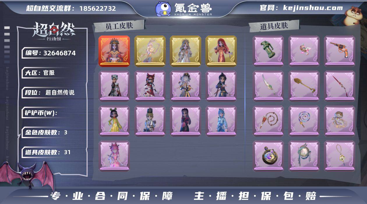ZR829 段位:超自然传说 红色皮肤数量:1 粉色皮肤数量:0 金色皮肤数量:3 紫色皮肤数量:9 稀有皮肤数量:0 白色皮肤数量:9 道具皮肤数量:31 铲铲币:25540000 累充:23400金砖 赛季魔盒:普通魔盒 员工:临云 小黄 爱丽丝 零 阿念 逍遥 薇薇安 巫铃儿 莉莉 艾伦 爱德华 兰 小满 外观:镜生遗梦 莲华渡 圣光之谕 镜花辞 黎明猎手 莓果陷阱 除妖小师妹 王子与骑士 情公主 水王子 丝缕哀歌 绣春逍影 呱呱雨衣 青苔绿 孔雀绿 宝石红 牛仔蓝 素雅白 后室幸存者 碧落 铃兰 樱桃果酱 道具:乘风溯雪 宝剑八 happy猫 甜蜜泡泡枪 小狗蛇点点鞭 金戈玄铜 碧络琅环 龙鳞 桃心 缚誓之锁 伏妖塔 鸣沙鼓 飞花令 凤鸣九天 紫霄 金丝眼镜 青玉抱丹 逆时审判 祝祷词 蔷薇物语 飞天绫 昆仑镜 星光的裁决 新星时代 牛啤背包 梵音莲华 天使的呼唤 蝶恋花 醉花阴 美妆:暗夜小恶魔 头饰:烛光纪念 太空鲨头套 雪墩墩头套 蒜了八 樱桃奶油布丁 惊魂南瓜头套 鱼头怪头套 烈焰红唇头套 大葱明头套 火爆了头套 面具马头套 哈士奇头套 萨卡班甲鱼头套 嘻嘻头套 滑稽头套 呆滞头套 卑微头套 小狗蛇点点头套 咬咬鲨头套 炙热烧烤 像素朋克墨镜 后室幸存者头套 挂饰:九色祥鹿 未竟乐园 小鲨包包 天使...