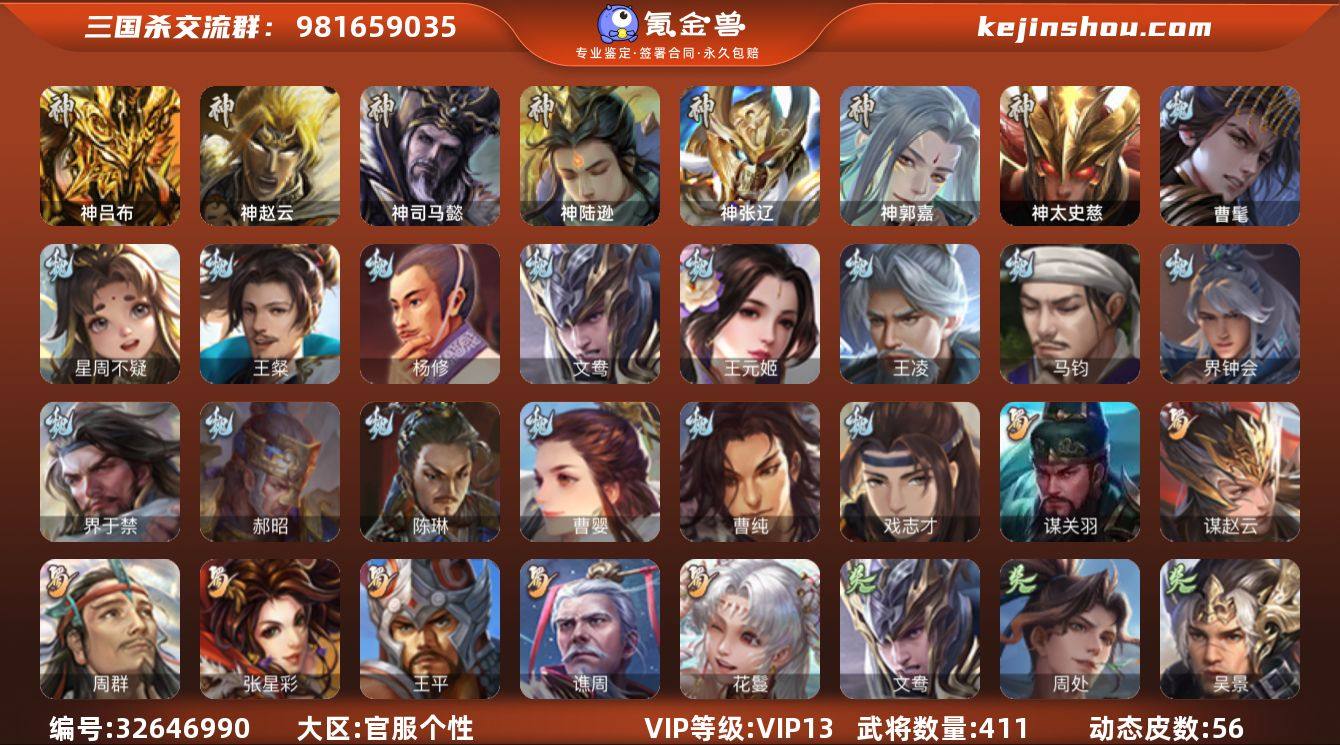 神吕布,神赵云,神司马懿,神陆逊,神张辽,神郭嘉,神太史慈,神关羽,神吕蒙,神周瑜,曹髦,星周不疑,王粲,杨修,文鸯,王元姬,王凌,魏-司马昭,马钧,界钟会,界于禁,郝昭,陈琳,曹婴,曹纯,戏志才,谋赵云,周群,张星彩,王平,谯周,花鬘,谋关羽,周处,吴景,孙皓,骆统,留赞,界朱然,界徐盛,谋郭嘉,左慈,张让,张琪瑛,杨彪,星黄忠,苏飞,司马徽,审配,麹义,南华老仙,刘焉,沮授,界左慈,界李儒,公孙康,杜预,谋张角,张绣,阎象,许攸,星董卓,神郭嘉-虎年清明(动态),神曹操-天下归心,星周不疑-才广志宏(动态),钟会-龙年端午(动态),曹丕-气荡山河(动态),甄姬-明珠耀躯(动态),SP蔡文姬-兔年冬日(动态),戏志才-举棋若定(动态),曹婴-兔年春节(动态),曹婴-锋芒毕露(动态),曹纯-虎年春节(动态),王元姬-鼠年冬至(动态),司马师-牛年中秋(动态),司马昭-昭威淮南(动态),张辽-龙生九子(动态),马超-虎年冬至(动态),马超-明良千古(动态),诸葛亮-明良千古(动态),界诸葛亮-明良千古(动态),关银屏-虎年端午(动态...