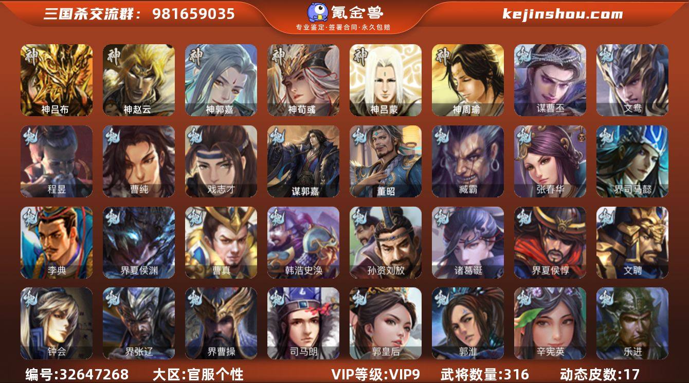 官阶:骠骑将军;VIP等级:VIP9;史诗武将数量:33;动态皮肤数量:17;武将总数:316;史诗宝珠数量:0;将魂数量:11986;神将:4;魏国史诗武将:10;蜀国史诗武将:6;吴国史诗武将:8;群史诗武将:13