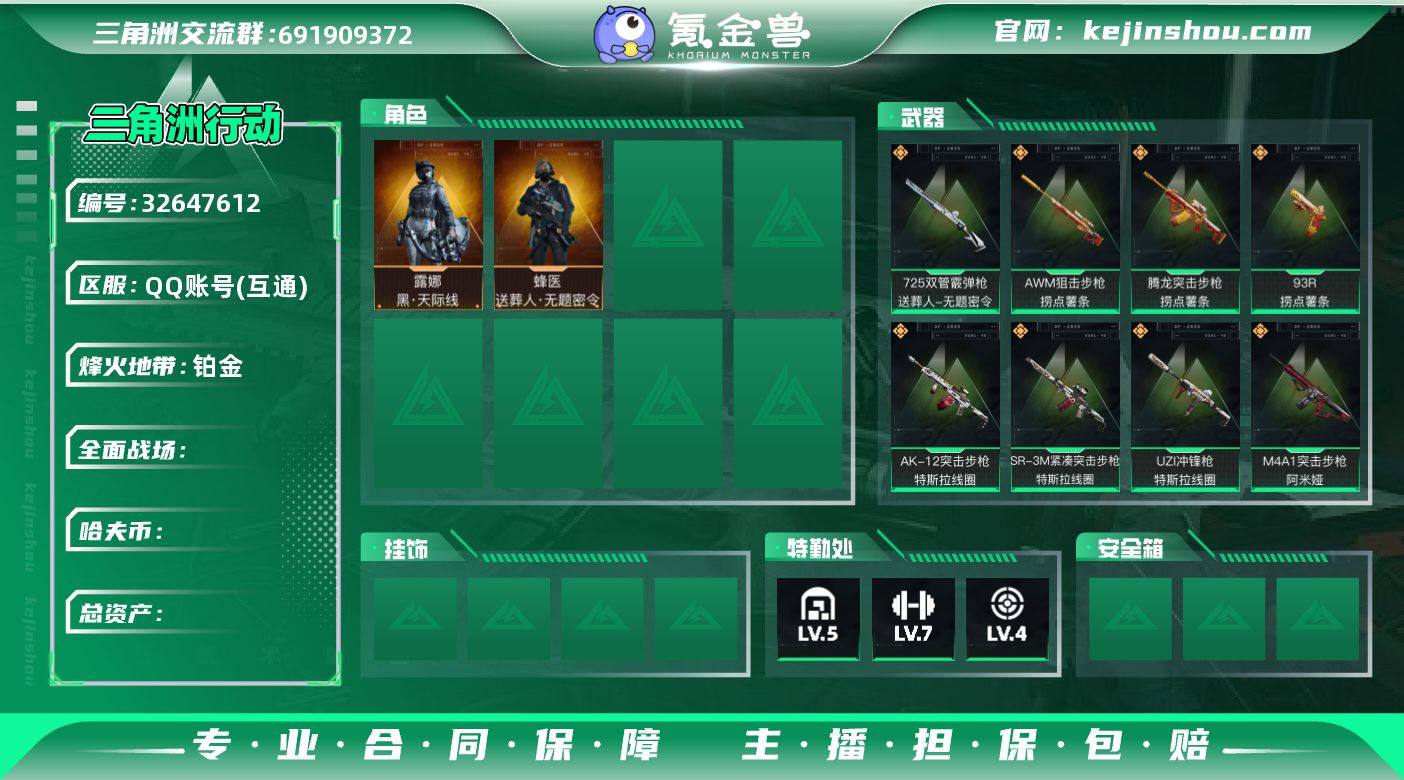 总资产:141.1M 2干员外观 2近战传说 31传说枪械 哈夫币:70.098K 不可修改实名 【烽火地带段位】钻石 【全面战场段位】无段位 【干员外观】露娜-黑·天际线,蜂医-送葬人·无题密令(S5) 【传说武器皮肤】近战武器-暗星,近战-电锯惊魂,UZI冲锋枪-特斯拉线圈,AK-12突击步枪-特斯拉线圈,93R-捞点薯条,腾龙突击步枪-捞点薯条,AWM狙击步枪-捞点薯条,SR-3M紧凑突击步枪-特斯拉线圈,S12K霰弹枪-电锯惊魂,M14射手步枪-电锯惊魂,SCAR-H战斗步枪-启航,ASh-12战斗步枪-鹅鸭杀,QCQ171冲锋枪-鹅鸭杀,QJB201轻机枪-鹅鸭杀,KC17突击步枪-电锯惊魂,勇士冲锋枪-万金泪冠,腾龙突击步枪-万金泪冠,AWM狙击步枪-万金泪冠,SR-3M紧凑突击步枪-茶蘼,PKM通用机枪-茶蘼,47突击步枪-暗星,SR-3M紧凑突击步枪-暗星,K416突击步枪-行动记录,腾龙突击步枪-马年祥瑞,G18-马年祥瑞,SCAR-H战斗步枪-茶蘼,复合弓-黑-天际线,CAR-15突击步枪-阿米娅,725双管霰弹枪-送葬人-无题密令,M4A1突击步枪-阿米娅,SMG45冲锋枪-骑士