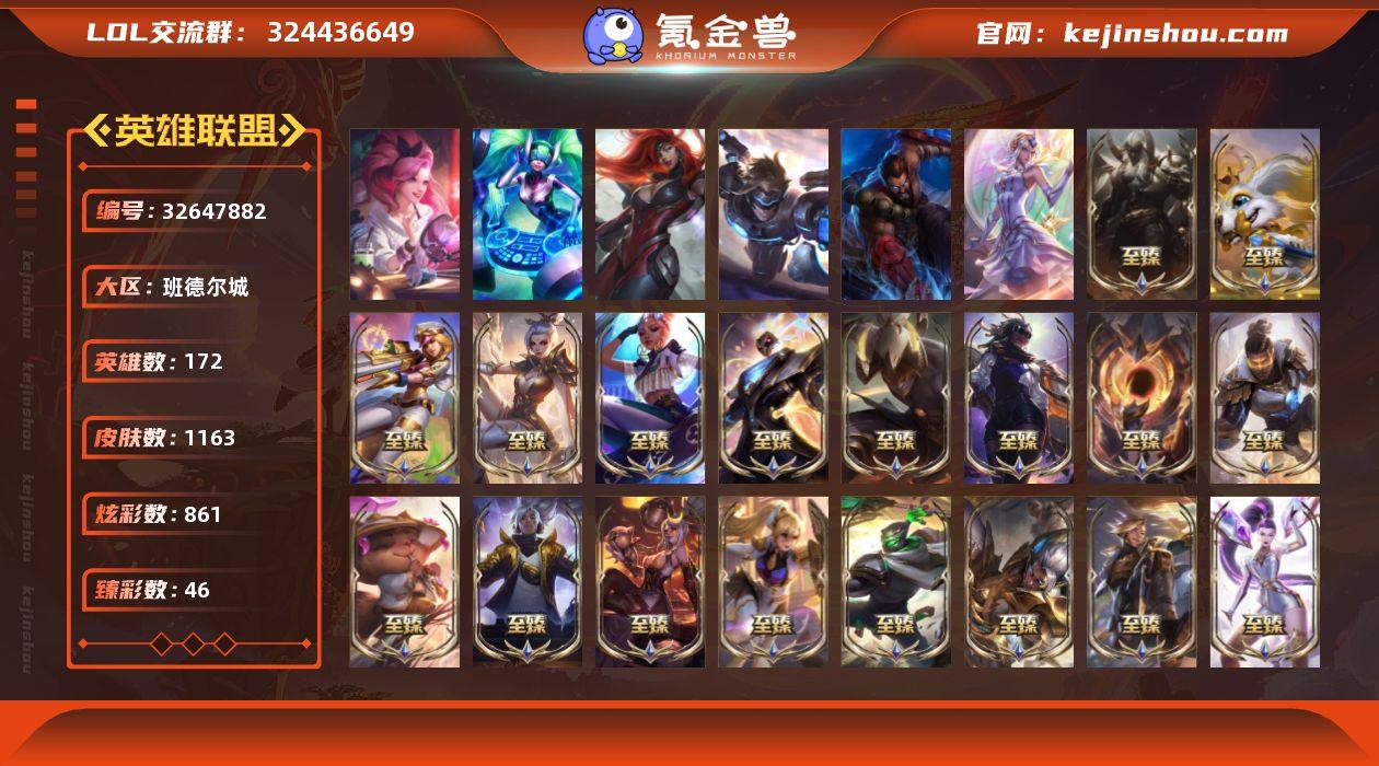 满英雄,1163皮肤,861炫彩,46臻彩,6终极,57神话,257限定,三色龙虾,花木兰,奥斯曼大帝,冰原狙击,哥特+梦游+舞会安妮,庆典女皇,卧虎藏龙,龙瞎龙猴龙琴龙刀龙嘴一套,青年瑞兹,战队皮从S1到EDG冠军全满,斩星+穿星+创星,各种情人节泳池电玩等等。