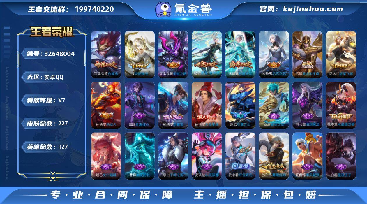说 127英雄 227皮肤 可修改实名 男号 【英雄全皮】敖隐全皮,大禹全皮 【稀有英雄】敖隐(小龙人),大司命,韩信(韩跳跳),夏洛特(夏师傅),艾琳,橘右京(橘子),娜可露露(鸟人),不知火舞,赵云,金蝉(唐僧),戈娅 【荣耀水晶】千魇归渊 【传说皮】乘龙·铭钟鼎(赵云年限),黄金射手座,地狱火,地狱之眼,冠军飞将,炽阳神光,记忆之芯(机甲兔),澜逐花归海 【珍宝阁皮】妄想食味,万物之道 【赛季/战令皮】噬灭天穹(s37),古海寻踪(s33),顽趣-梦奇,剑破天穹(s35),天穹祈灯(s34),天穹之誓(s36),炼金王(s6),凯尔特女王(s7),狰(s8),饕餮(s9),烛龙(s10),重明(s11),穷奇(s12),御狮(s13),御霄(s14),御旌(s15),御銮(s16),朔风刀(s17),混沌棋(s18),疑决卦(s19),醍醐杖(s20),万华元夜(s22),演武夺筹(s23),驱傩正仪(s24),猎兽之王,白昼王子,朔望之晖,蓝屏警告,赤莲之焰,驯魔猎人,沙漠行僧(s26) 【史诗皮】破空之剑,蒙犽顽岩魄,线条小狗-周瑜,九幽镇关,线条小狗-小乔,灵蛊蚀心,百相守梦-黄忠,紫霞仙子,白龙吟,特工魅影,千年之狐,冰冠公主,偶像歌手,龙骑士(小龙虾),末日机甲-吕布,猫狗日记-孙策,乱世虎臣,节奏热浪,女仆咖啡,摇滚巨星,水果甜心,天才门将,星夜王子,心灵骇客,功夫厨神,德古拉伯爵,暗隐猎兽者,幽...