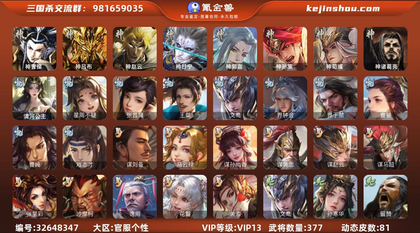 【1406】官阶:大将军;VIP等级:VIP13;史诗武将数量:51;动态皮肤数量:81;武将总数:377;史诗宝珠数量:2;将魂数量:3654;神将:9;魏国史诗武将:25;蜀国史诗武将:12;吴国史诗武将:6;群史诗武将:15 神曹操,神吕布,神赵云,神甘宁,神郭嘉,神孙策,神荀彧,神周瑜,神诸葛亮,星周不疑,张昌蒲,王粲,文鸯,魏-司马昭,界钟会,界于禁,曹婴,曹纯,戏志才,清河公主,关索,谋刘备,马云騄,谋孙尚香,谋黄忠,谋赵云,谋马超,张星彩,沙摩柯,谯周,花鬘,孙寒华,留赞,界朱然,界徐盛,界步练师,贺齐,界沮授,左慈,郑玄,张让,徐荣,星黄忠,麹义,庞德公,刘焉,沮授,杜预,谋张角,李傕,许攸,星董卓,神郭嘉-虎年清明(动态),神郭嘉-倚星折月(动态),神孙策-霸王再世(动态),神荀彧-虎年清明(动态),神荀彧-匡汉延祚(动态),神甘宁-万人辟易(动态),神曹操-玄天通冥(动态),神吕布-冠绝天下(动态),神赵云-战龙在野(动态),王元姬-婆娑起舞(动态),星周不疑-才广志宏(动态),钟繇-安民护祚(动态),曹丕-龙年中秋(动态),SP蔡文姬-兔年冬日(动态),邓艾-神兵天降(动态),张春华-雪中舞刃(动态),曹婴-兔年春节(动态),曹婴-水清灈缨(动态),司马昭-昭威淮南(动态),星徐晃-斧引霹雳(动态),王异-倾天泻雨(动态),清河公主-魅影...