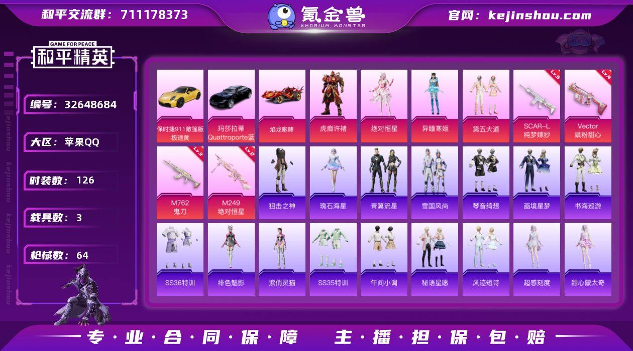 实名: 可修改 时装数: 126 载具数: 3 枪械数: 64 战备数: 3 热门装扮: 第五大道,异瞳寒姬,绝对恒星,虎痴许褚 载具: 焰龙咆哮,玛莎拉蒂Quattroporte(夜幕蓝),保时捷911敞篷版(极速黄) 稀有枪皮: SCAR-L纯梦嫁纱,Vector飒粉甜心,M762-鬼刀,M249-绝对恒星