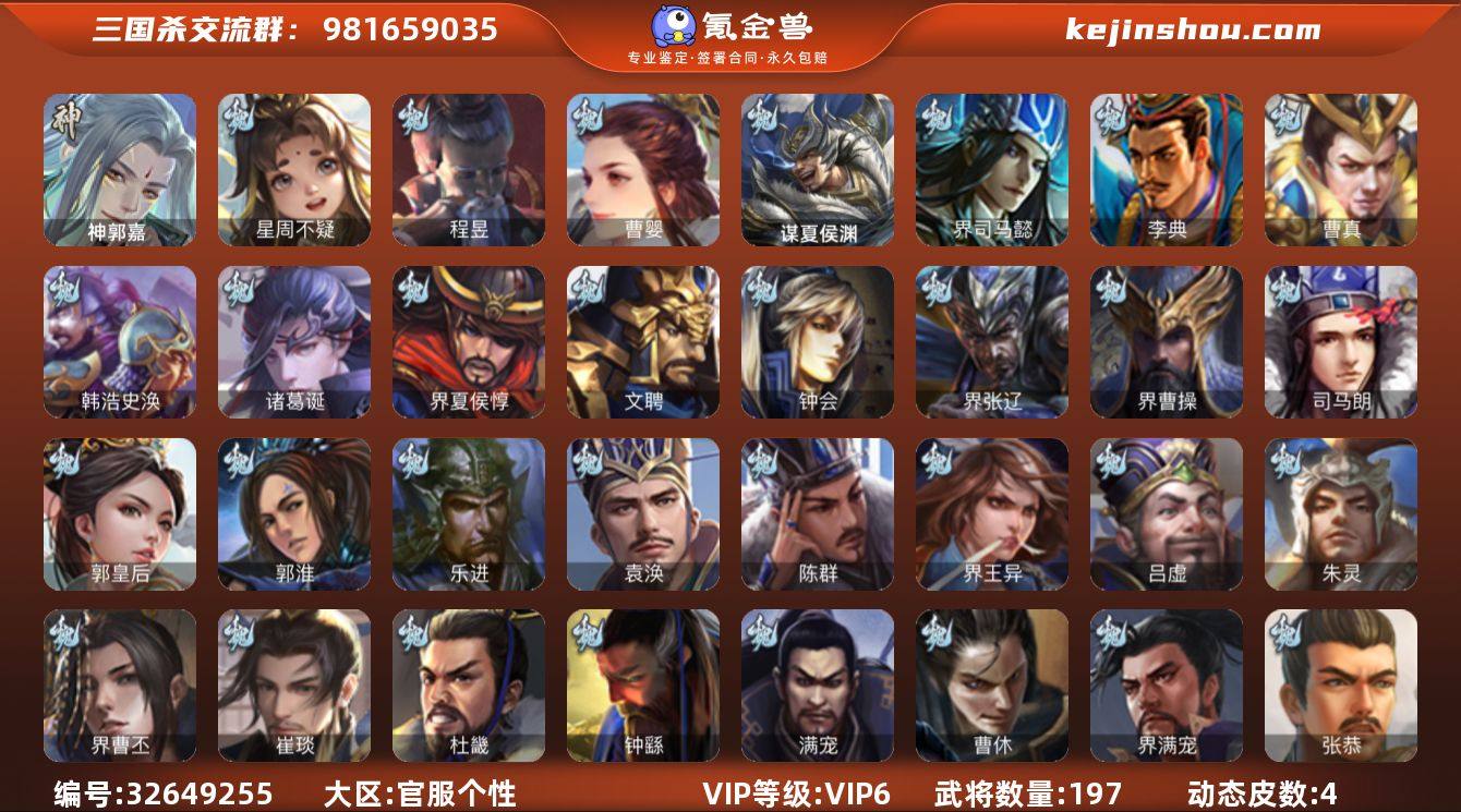 【4229】官阶:中军将军;VIP等级:VIP6;史诗武将数量:12;动态皮肤数量:4;武将总数:197;史诗宝珠数量:1;将魂数量:519;神将:1;魏国史诗武将:2;蜀国史诗武将:3;吴国史诗武将:2;群史诗武将:3