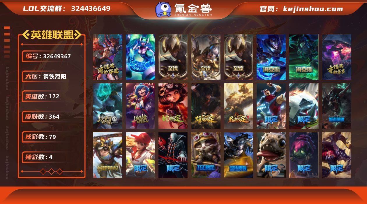 【开头连号333 不含4和7】未定级段位-172英雄-364皮肤-79炫彩-2终极-8神话-53限定-31传说-102史诗 【珍稀头像】:至爱的鹿头像 【神话皮肤】:十周年纪念安妮,源代码乐芙兰,暗星科加斯 【至臻皮肤】:至臻黑夜使者李青,至臻黑夜使者李青(2022),至臻神龙尊者炎龙瑟提 【海克斯皮肤】:海克斯科技嘉文四世,摄魂使者薇恩 【臻彩皮肤】:冠军之箭艾希凯旋圣装,神龙尊者圣龙李青龙腾云起,泳池派对凯特琳粉红冰川 【年限皮肤】:你看见过我的熊猫吗安妮,虎痴之拳蔚,北辰之威内瑟斯 【情人节限定】:甜心宝贝娑娜,觅心魔灵奥莉安娜 【冰雪限定】:冰雪风暴希维尔,圣诞开心鬼提莫,圣诞狂欢努努和威朗普,阿木木“主人不要我了”,胡桃夹子萨科,平安夜女神娑娜,喜庆之树茂凯,雪默丁格,圣诞玩偶波比,圣诞老人古拉加斯,圣诞驯鹿克格莫,冰雪节辛吉德,冰雪女神辛德拉 【终极皮肤】:DJ娑娜,斗魂觉醒莎弥拉 【限定皮肤】:诺斯费拉图弗拉基米尔,送披萨的小姐姐希维尔,冠军之血希瓦娜,冠军之箭艾希,Fnatic迦娜,Fnatic库奇,暗杀星蒙多,暗杀星慎,SKTT1李青,SSW泰隆,SKTT1烬,胜利女神奥莉安娜,胜利之剑亚托克斯,胜利之王泰达米尔,胜利巨口克格莫,胜利女神娑娜...