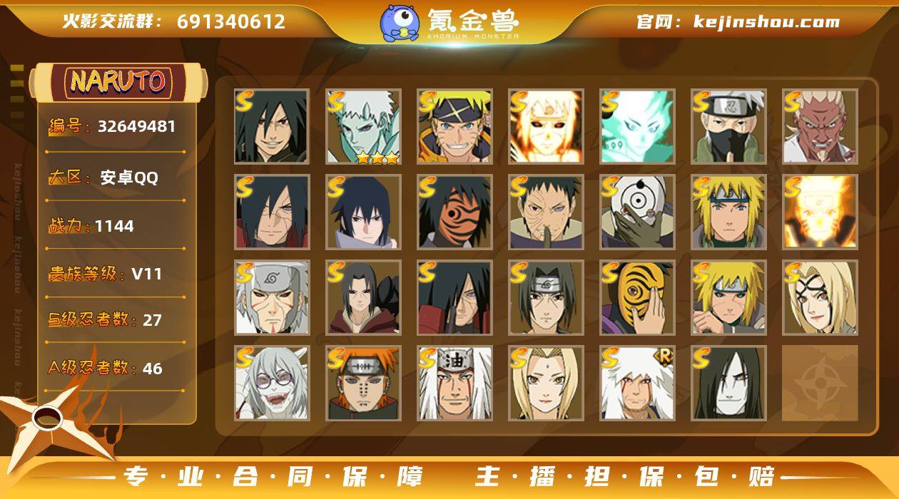 实名: 可修改 贵族等级: V11 S忍数: 27 A忍数: 46 战力值(万): 1144 S级忍者: 宇智波鼬「秽土转生」,药师兜「仙人模式」,宇智波斑「秽土转生」,千手扉间「秽土转生」,纲手「百豪」,波风水门「秽土转生」,神秘面具男,佩恩「天道」,大蛇丸,波风水门,纲手,自来也,宇智波鼬 「须佐能乎」,宇智波带土 「忍界大战」,自来也 「舞之豪杰」,宇智波斑「白面具」,漩涡鸣人 「九喇嘛连结」,神秘面具男 「红夜之刃」,宇智波佐助「永恒万花筒」,宇智波斑「秽土转生·解」,艾「忍界大战」,旗木卡卡西「须佐能乎」,大筒木舍人 「最终章」,波风水门「九喇嘛连结」,漩涡鸣人·宇智波佐助,宇智波带土「十尾人柱力」,宇智波斑「神驹佑将」 通灵兽: 熊猫 亮点: 【优质装备】:熊猫,宇智波鼬「秽土转生」,药师兜「仙人模式」,宇智波斑「秽土转生」,千手扉间「秽土转生」,纲手「百豪」,波风水门「秽土转生」,神秘面具男,宇智波带土 「忍界大战」,宇智波斑「白面具」,漩涡鸣人 「九喇嘛连结」,神秘面具男 「红夜之刃」,宇智波佐助「永恒万花筒」,宇智波斑「秽土转生·解」,艾「忍界大战」,旗木卡卡西「须佐能乎」,大筒木舍人 「最终章」 霸体lv10
