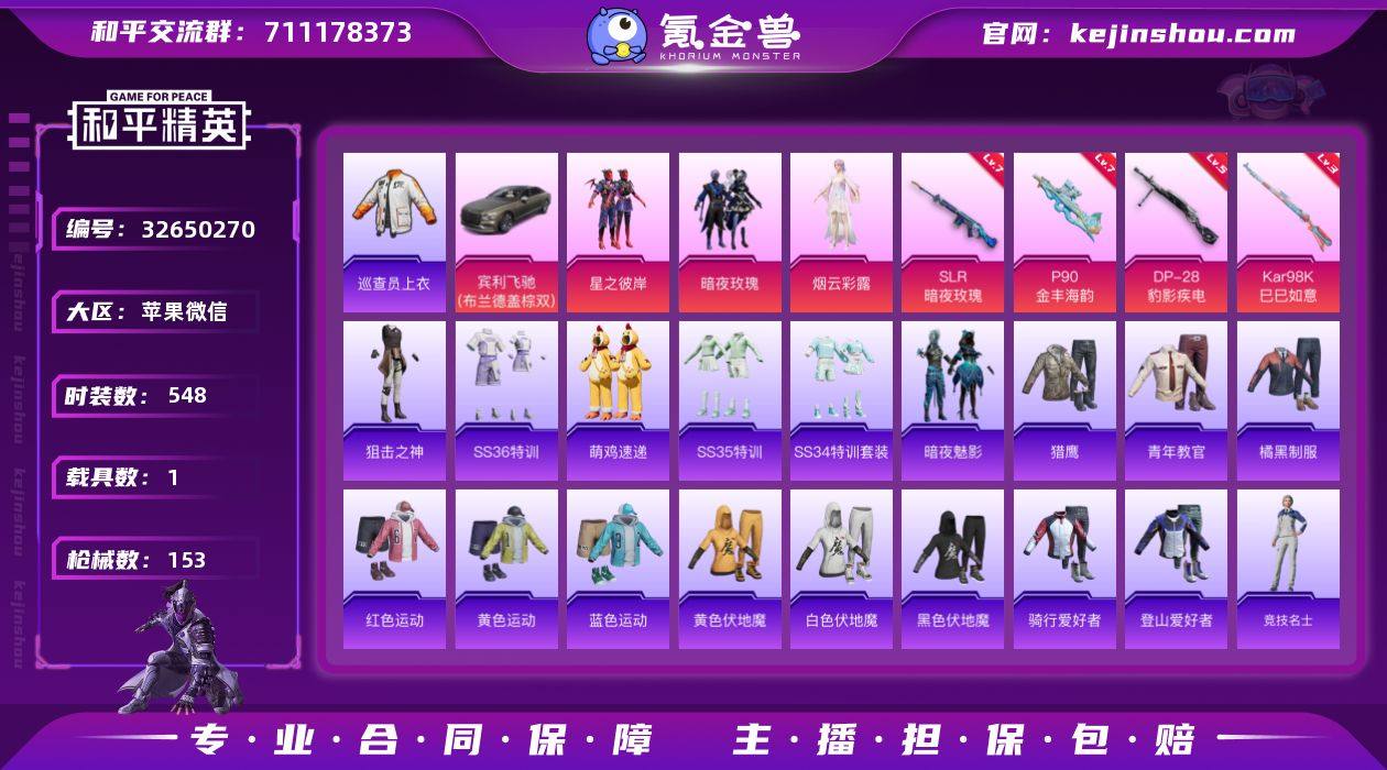 实名: 可修改 时装数: 548 载具数: 1 枪械数: 153 战备数: 1 热门装扮: 星之彼岸,巡查员衣服,暗夜玫瑰,暗夜魅影,烟云彩露 载具: 宾利飞驰(布罗德盖棕双色) 稀有枪皮: SLR暗夜玫瑰,P90-金丰海韵,Kar98K-巳巳如意,DP-28-豹影疾电 亮点: 【优质装备】:巡查员衣服(绝对防御上衣),巡查衣(绝对防御上衣),七级SLR-暗夜玫瑰,七级P90-金丰海韵