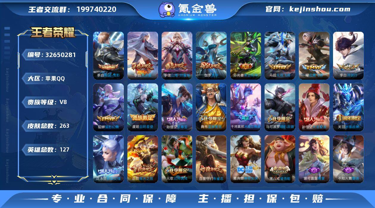苹果Q-V8【发育路41段/5金标】-荣耀黄金I段位-127英雄-263皮肤-1典藏皮肤-9传说-82史诗 【英雄全皮】:猪八戒全皮 【荣耀典藏】:李白鸣剑曳影 【传说皮肤】:李信山海炽霜斩,李白诗剑行,马超无双飞将,虞姬启明星使,曜云鹰飞将,伽罗太华,貂蝉猫影幻舞,李白凤求凰,孙尚香末日机甲 【限定皮肤】:白起狰,李白谪仙醉月,狄仁杰阴阳师,虞姬凯尔特女王,赵云皇家上将,嬴政优雅恋人,嬴政白昼王子,孙尚香蔷薇恋人,鲁班七号狮舞东方,庄周高山流水,高渐离死亡摇滚,阿轲迷踪丽影,孙膑天狼运算者,扁鹊炼金王,扁鹊奇幻香踪,白起夜都怪侠,芈月重明,芈月幻夜卜梦,吕布猎兽之王,周瑜赤莲之焰,元歌云间偶戏,元歌无心,夏侯惇朔风刀,曹操烛龙,典韦穷奇,典韦蓝屏警告,马可波罗暗影游猎,狄仁杰魔术师,狄仁杰万华元夜,达摩沙漠行僧,项羽海滩派对,老夫子醍醐杖,关羽冰锋战神,程咬金演武夺筹,露娜一生所爱,刘邦夺宝奇兵,韩信飞衡,兰陵王驯魔猎人,兰陵王金庭之子,花木兰默契交锋,亚瑟潮玩骑士王,孙悟空至尊宝,孙悟空大圣娶亲,牛魔御旌,后羿辉光之辰,后羿圣弓游侠,李元芳银河之约,李元芳云中旅人,虞姬霸王别姬,虞姬启明星使,钟馗神迹守卫,钟...