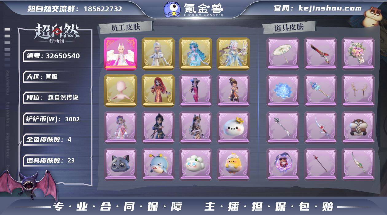 红色皮肤数量: 1 金色皮肤数量: 4 紫色皮肤数量: 8 道具皮肤数量: 23 段位: 超自然传说 外观: 镜花辞,白光莹,蝶恋花,钗头凤,绣春逍影,甜梦派对,子夜证词,耀眼的你,庆宴绮愿,炽天使,天使之泪,炽天使的余烬,晚安小熊,瑶台梦,拂云仙,不朽的今夜,牛啤背包,海月息潮,剑仙,饺饺者头套,夜浮船,孤独对望,园丁鲨鲨头套,蛋黄啵啵,煤球喵,芝麻糊汤圆