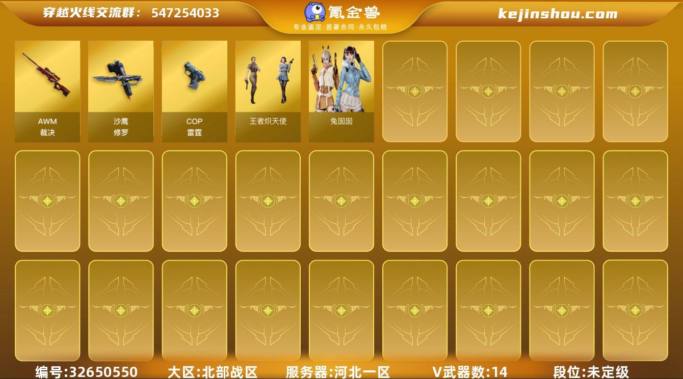 河北一区-18V-0王者武器数-0炫金武器数 【热门武器】:沙鹰-修罗 【皮肤】:HK417-朱雀-掌火灵橙 皮肤 【角色】:王者炽天使,乔伊教练,风暴女,兰-新年限定,曼陀罗-X,潘多拉-X,铁骑-乘风破浪,兔囡囡,夜玫瑰-幻能朋克,影武者-X 【人偶武器】:迷你裂空之翼*2 【挑战大师】:神圣爆裂者-末日III 【英雄级武器】:AWM-裁决,沙鹰-修罗,COP-雷霆,柯尔特-电竞之星,高爆手雷-雷霆,手雷-动感闪耀,闪光弹-雷霆,烟雾弹-雷霆 【道具】:冰冰企鹅背包,炫彩背包,超级背包,绿色巨人,灵魂忍者,迷雾幽灵,夺命之镰,防化服*2,金色流光-枪王排位*2,枪王排位28赛季金色流光,防弹头盔*3,防弹衣*3,C4工具钳*3,手雷包*3 【特殊枪械】: