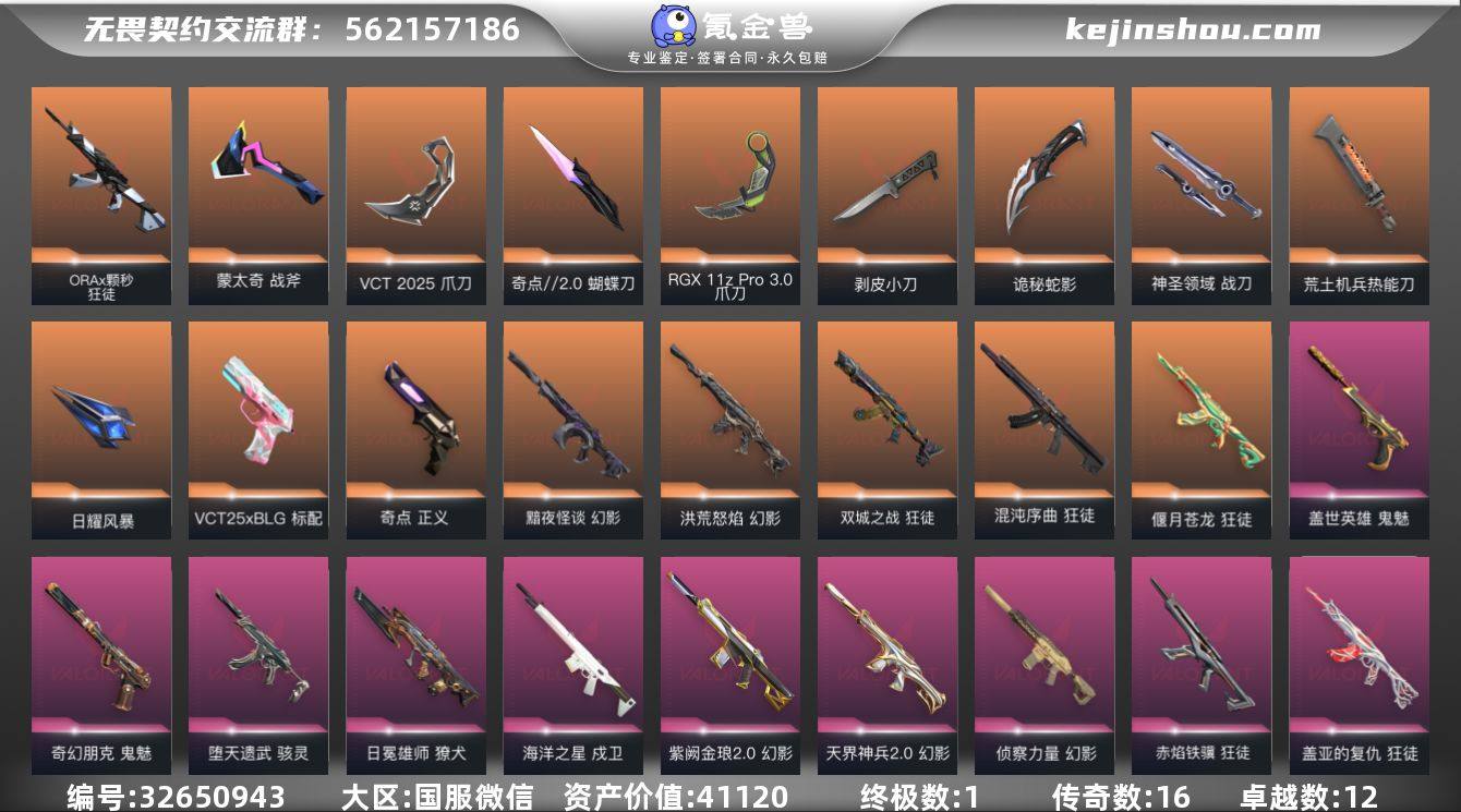 段位: 未定级 套装: VCTCN2025套装,VCT 2025赛季礼包 近战武器皮肤: 剥皮小刀-异形猎人,爪刀-RGX 11z Pro 3.0,蝴蝶刀-奇点//2.0,荒土机兵热能刀,神圣领域 战刀,VCT 2025 爪刀,诡秘蛇影,日耀风暴,蒙太奇 战斧 步枪皮肤: 狂徒-盖亚的复仇,狂徒-偃月苍龙,幻影-侦察力量,幻影-紫阙金琅2.0,幻影-洪荒怒焰,幻影-天界神兵2.0,戍卫-海洋之星,獠犬-日冕雄师,狂徒-混沌序曲,幻影-黯夜怪谈,狂徒-双城之战,狂徒-ORAx颗秒,超集系统 狂徒,蒙太奇 幻影,风暴之子 戍卫,狂徒-赤焰铁骥 佩枪皮肤: 正义-奇点,鬼魅-盖世英雄,鬼魅-奇幻朋克,标配-VCT25xBLG,超集系统 标配,风暴之子 正义,蒙太奇 狂怒 狙击枪皮肤: 冥驹-堕天遗武,冥驹-掠影,风暴之子 冥驹,超集系统 飞将 冲锋枪皮肤: 骇灵-堕天遗武,蒙太奇 骇灵 霰弹枪皮肤: 风暴之子 雄鹿 机枪皮肤: 蒙太奇 战神 亮点: 【优质装备】:正义-奇点,狂徒-混沌序曲,狂徒-盖亚的复仇,狂徒-偃月苍龙,幻影-侦察力量,幻影-紫阙金琅2.0,冥驹-堕天遗武,幻影-洪荒怒焰,幻影-天界神兵2.0,幻影-黯夜怪谈,冥驹-掠影,鬼魅-盖世英雄,剥皮小刀,鬼魅-奇幻朋克,爪刀-RGX 11z Pro 3.0,蝴蝶刀-奇点//2.0,荒土机兵热能刀,神圣领域 战刀,VCT 2025 爪刀,诡秘蛇影,日耀风暴 遗器,...